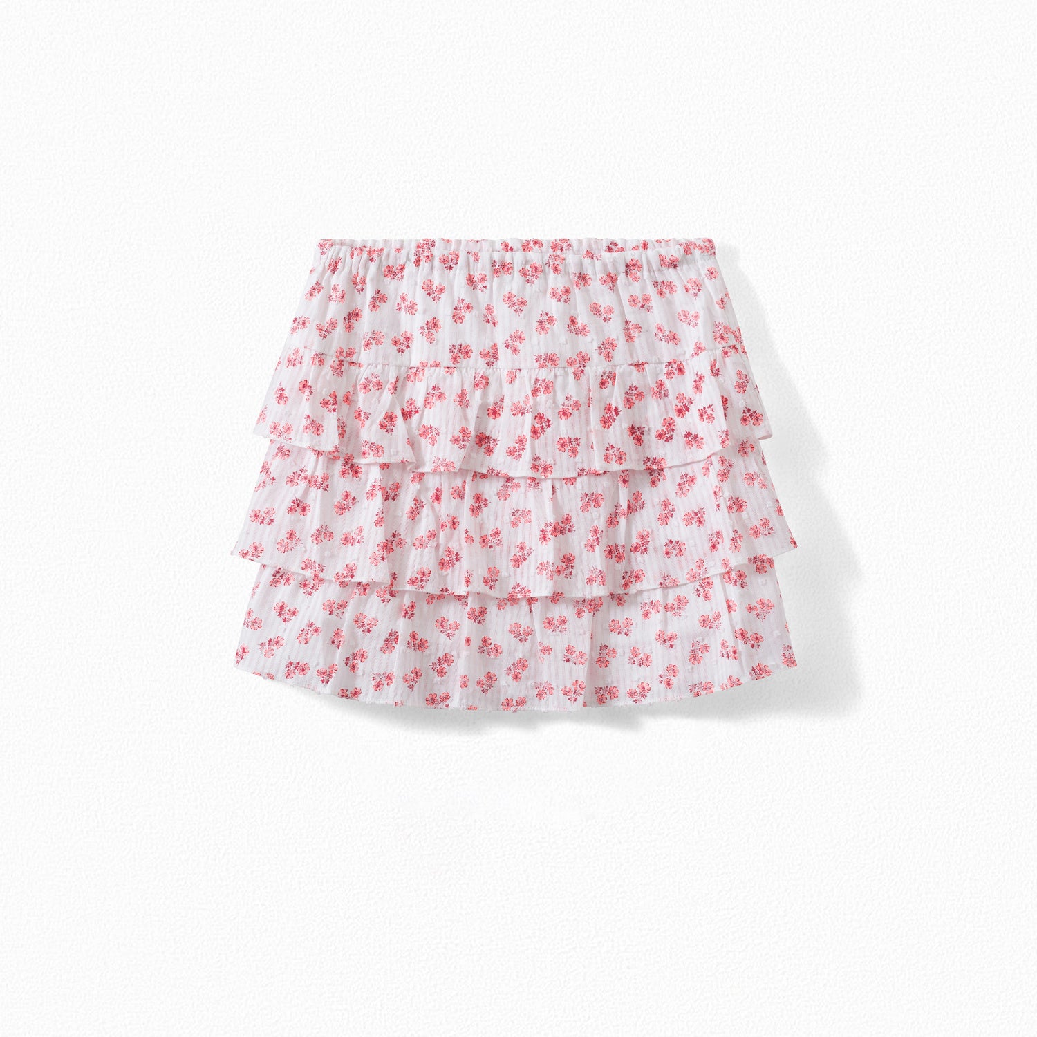 Small, romantic flowers decorate the Swiss dot voile of the Sanja girls' skirt. The multiple ruffles move gracefully with each step.