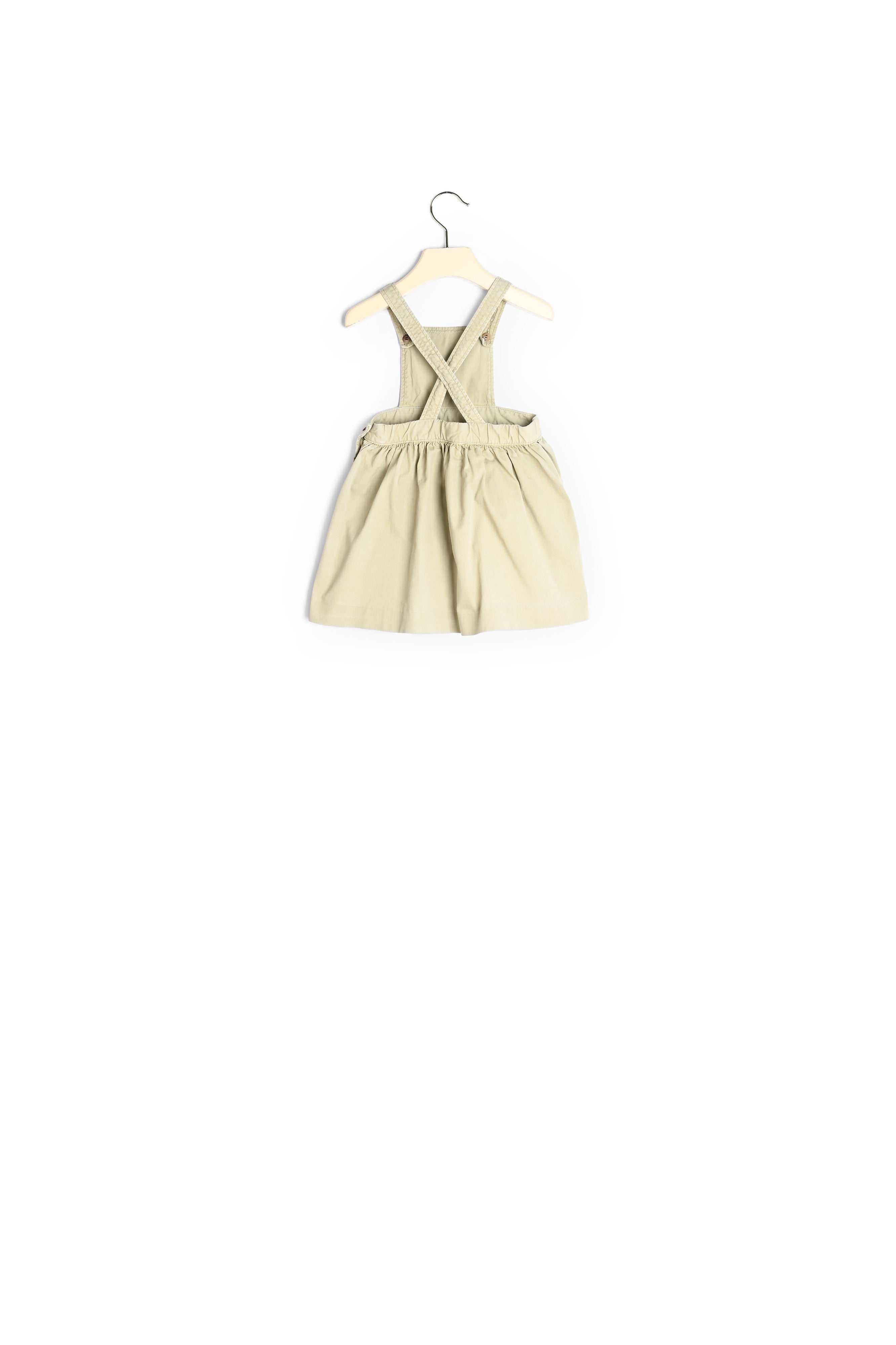 The Anise babies' dress features overall-inspired straps that cross at the back. Pleats at the waist structure this lightweight denim design.