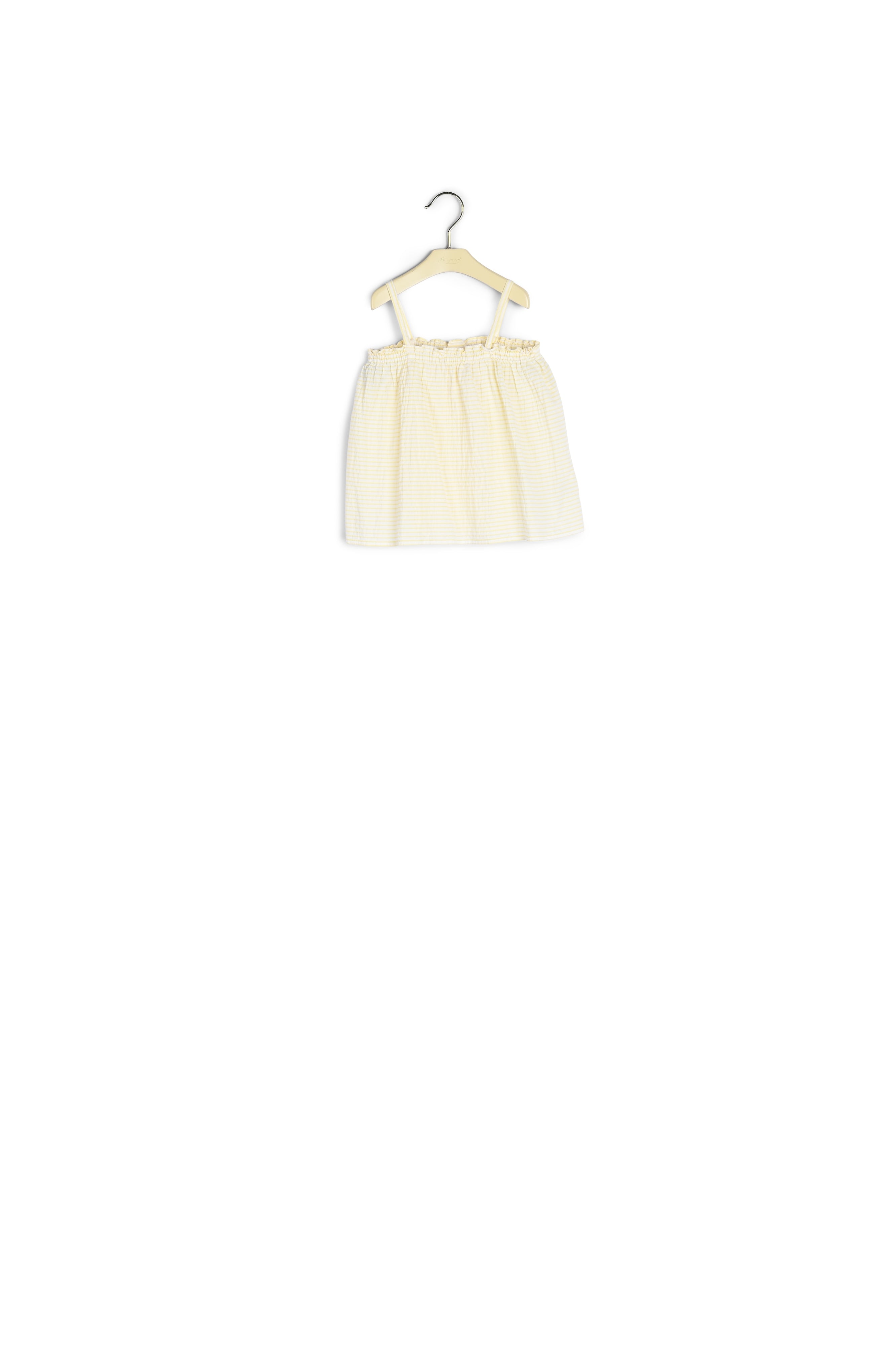Cheerful horizontal stripes decorate this Apo babies' blouse. The elastic at the top structures the flared cut creating lovely movement. Waffle cotton. Narrow straps. Buttons on the back.