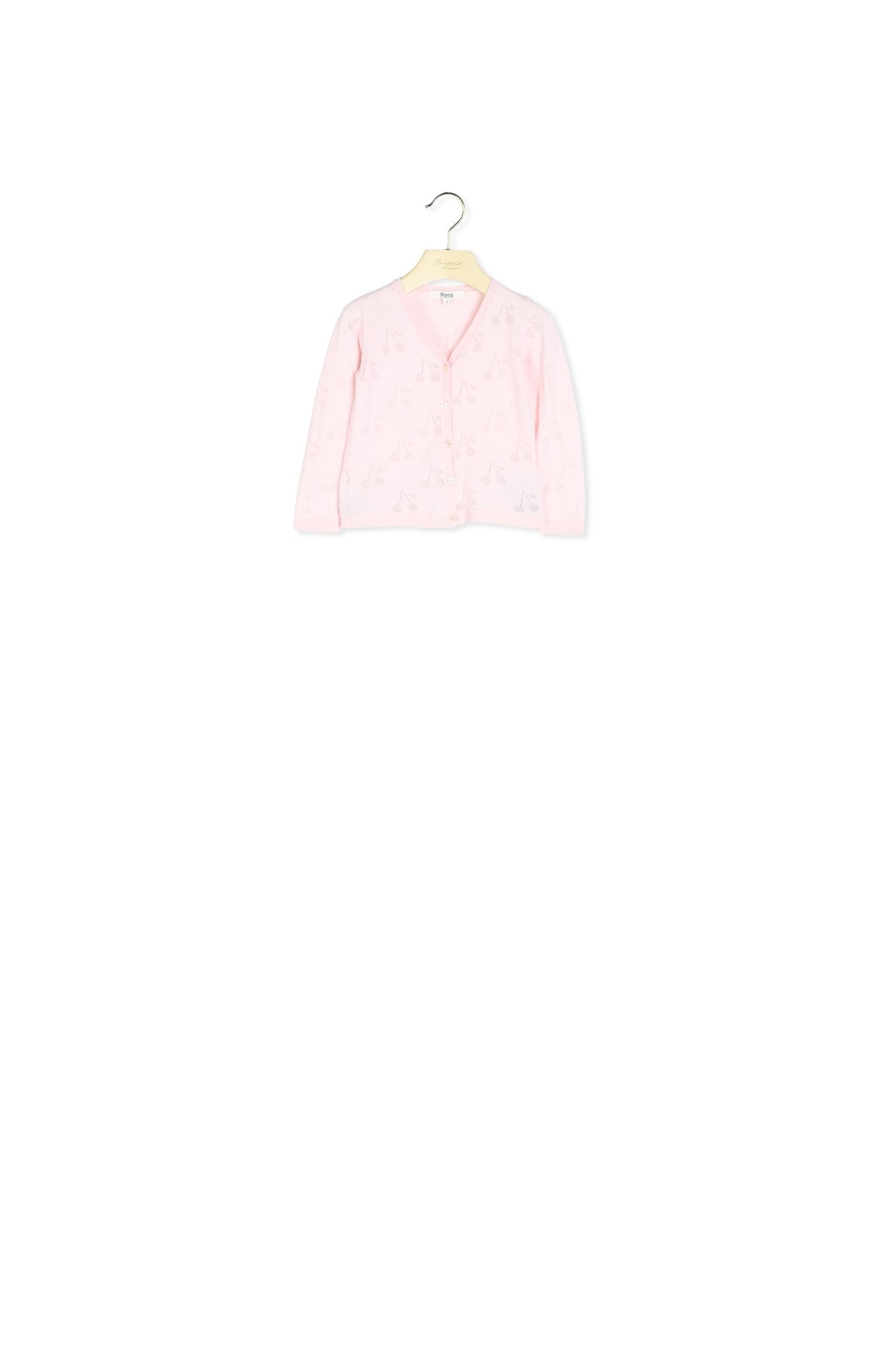 This baby cardigan takes center stage with its stunning openwork cherry design on the front. It is an emblematic piece from Bonpoint.