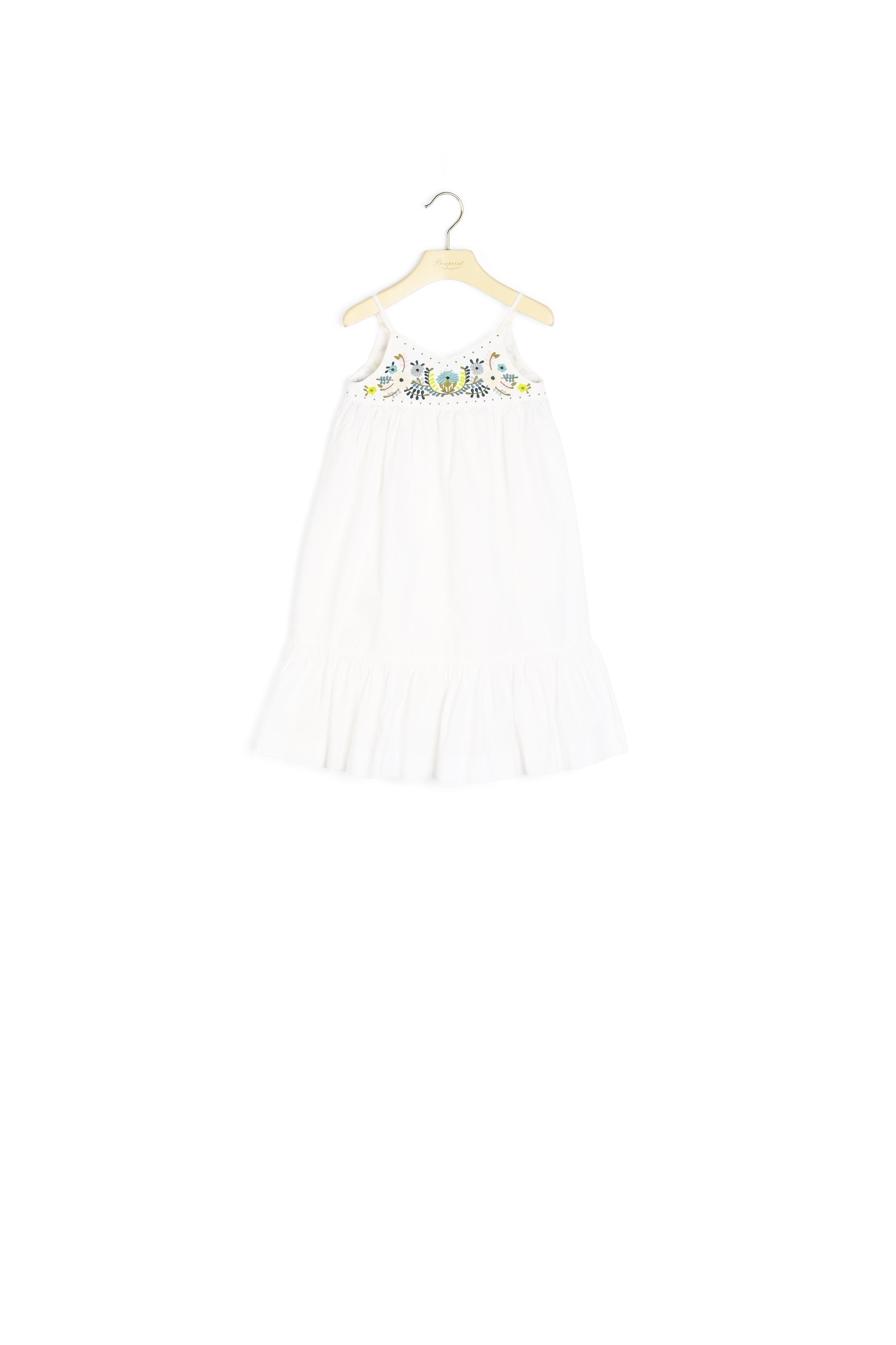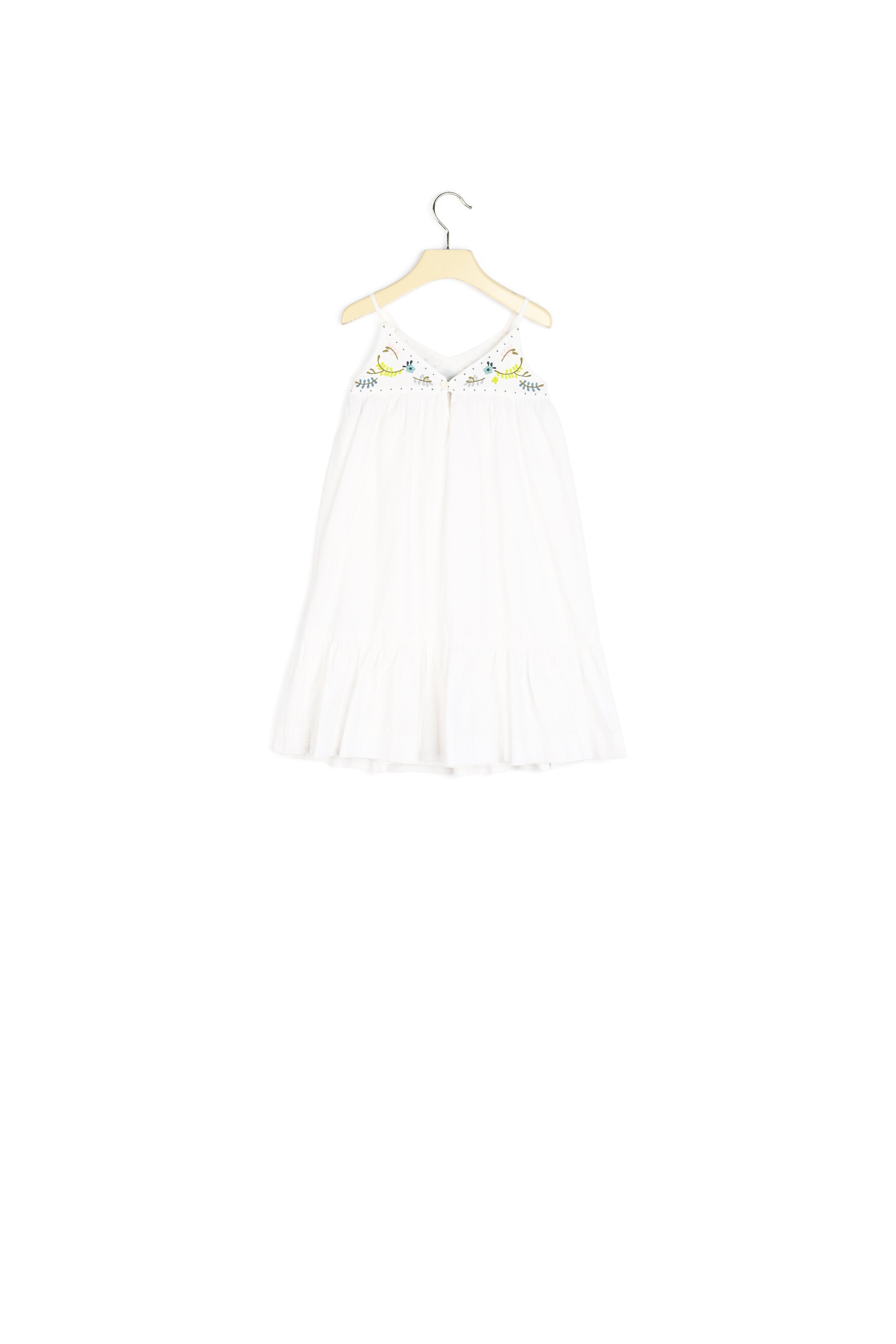 The Anya dress for girls stands out with its printed flowers on the chest, evoking South American craftsmanship. The ruffled hem swishes gracefully with each step. Cotton poplin. Thin straps. Contrasting buttons on the back.