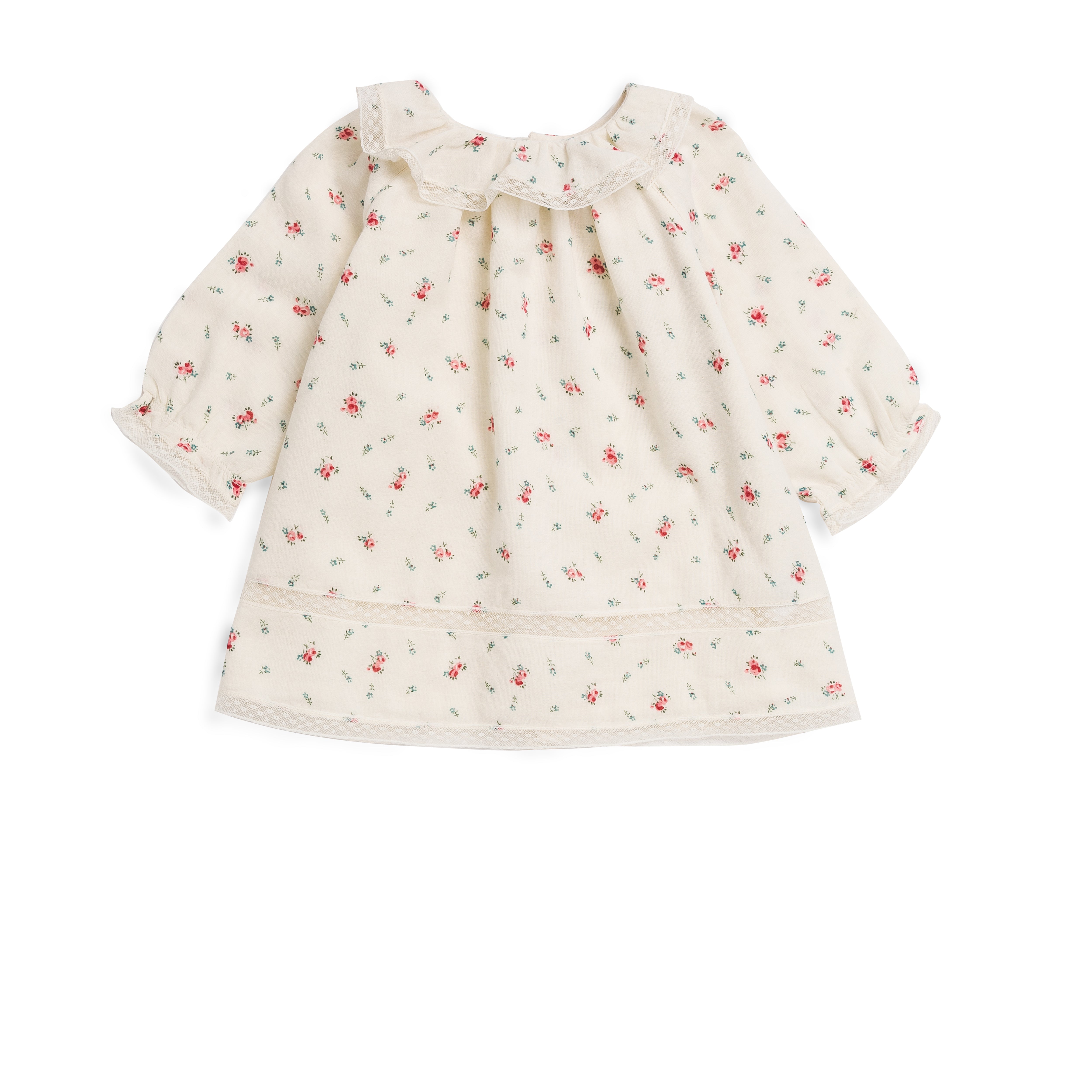 Double cotton dress with Calais lace inserts, frilled collar and buttoned back. Winter 2018 Baby Collection.