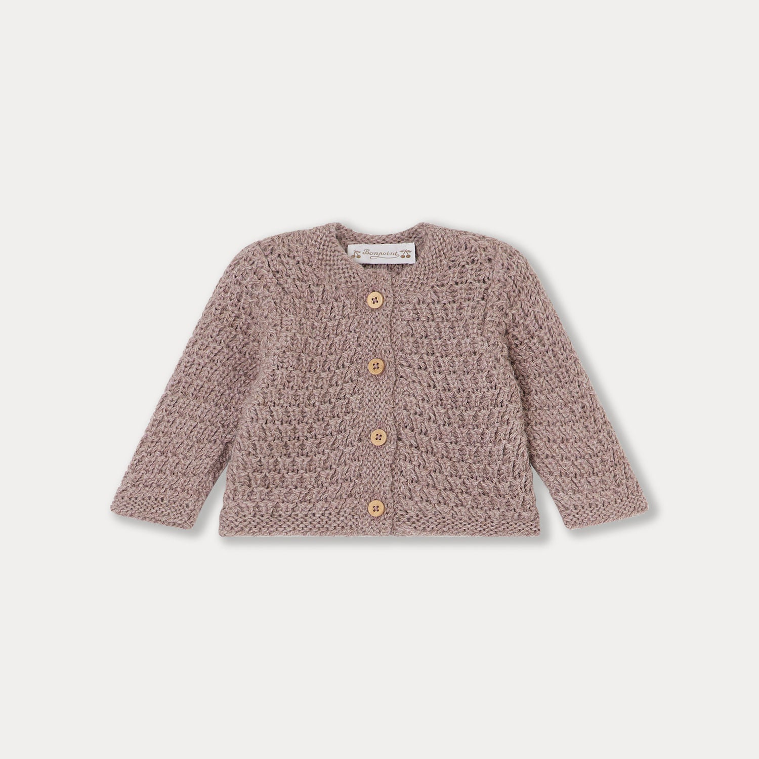 The Baia cardigan for babies stands out with its creative knit. This design made from alpaca wool makes the ideal baby shower gift to protect little ones from the cold.  Alpaca wool. Crew neck. Four wooden buttons.