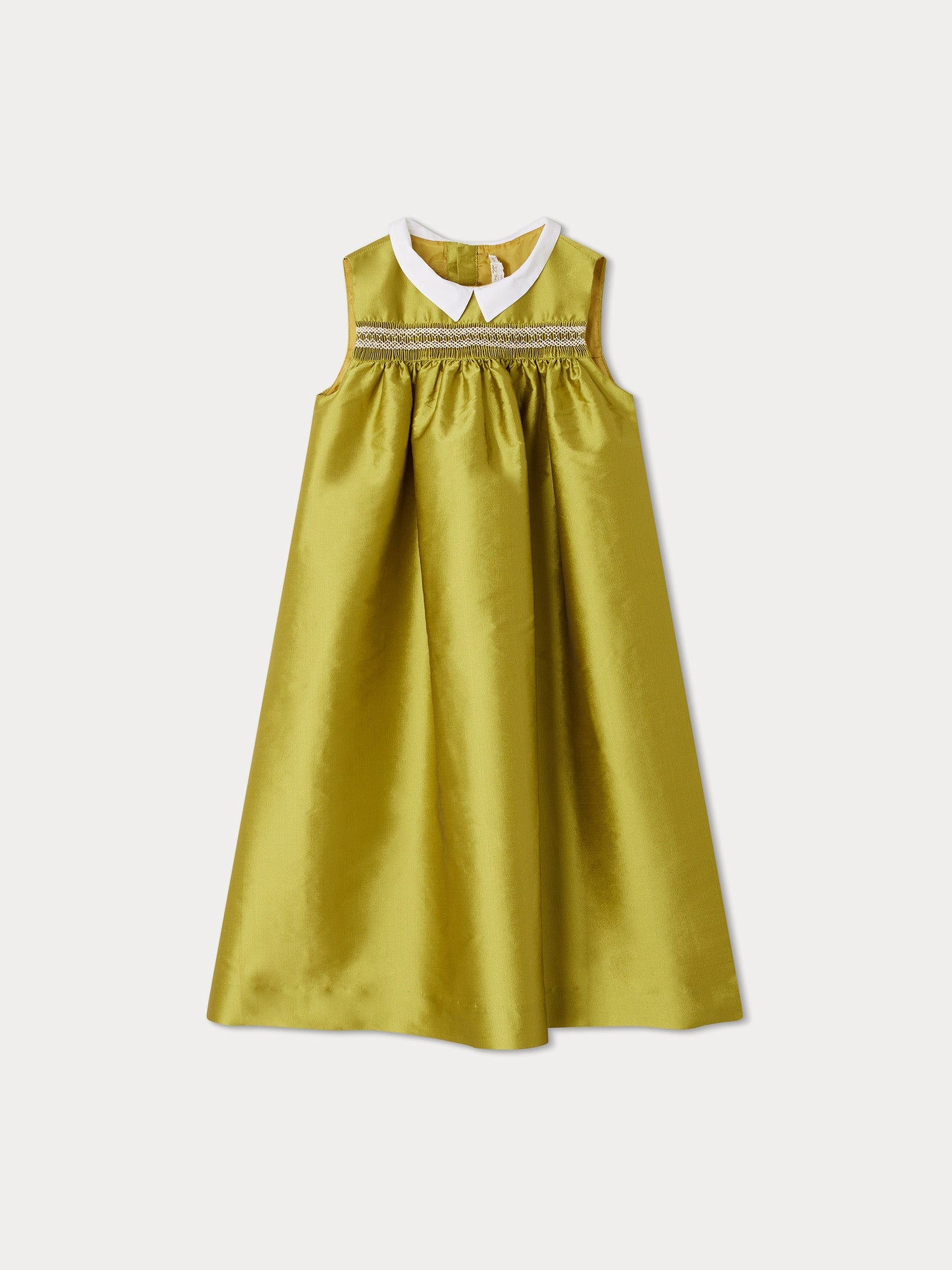This charming Ciliegia dress for girls features embroidered smocking on the chest and a contrasting shirt collar. Its elegance is enhanced by its silk taffeta fabric. Sleeveless. Back button closure . Gathers.