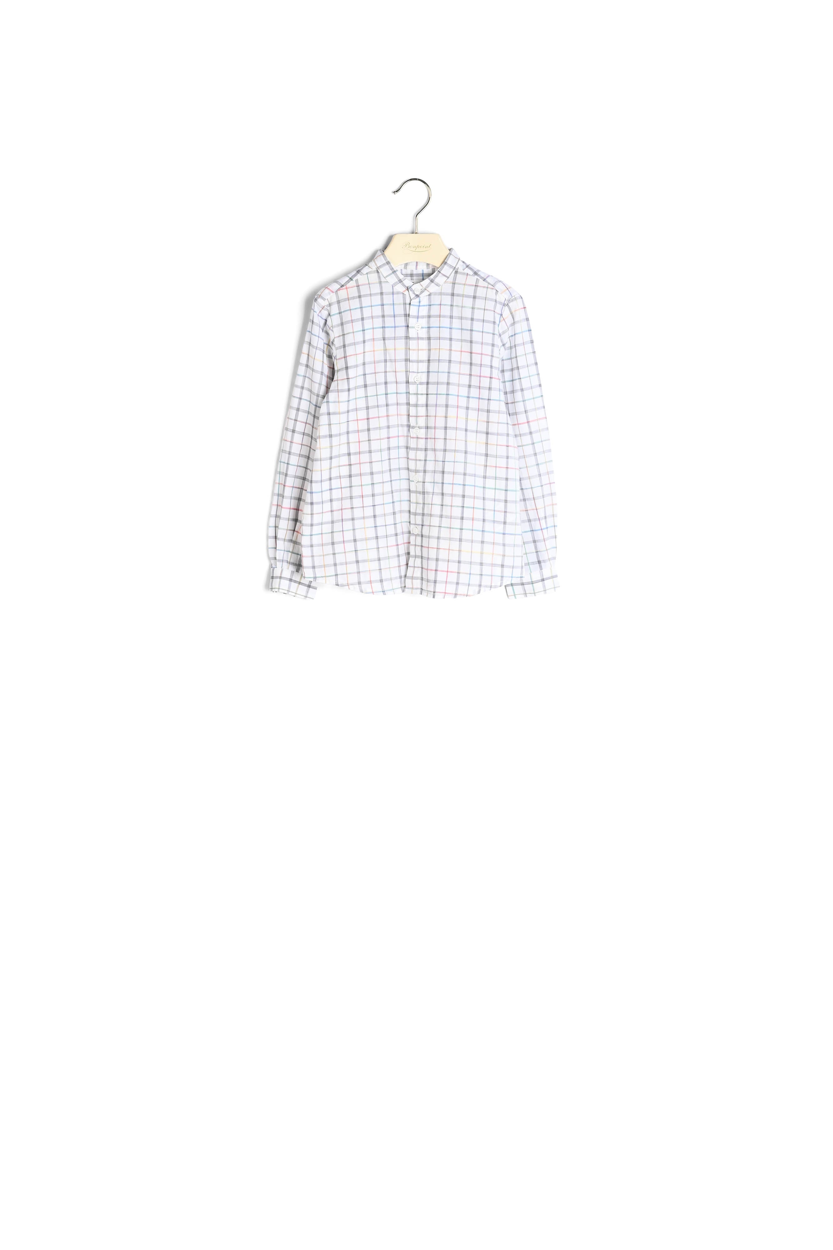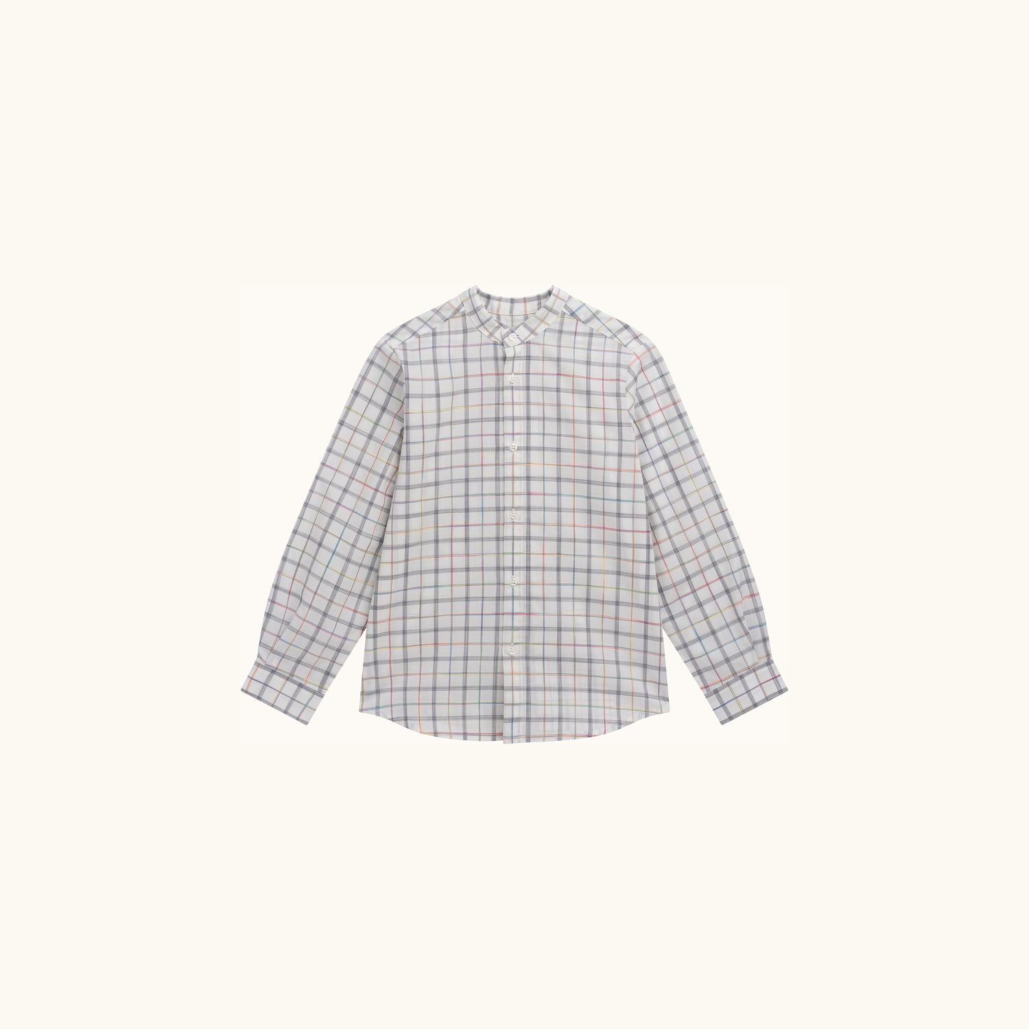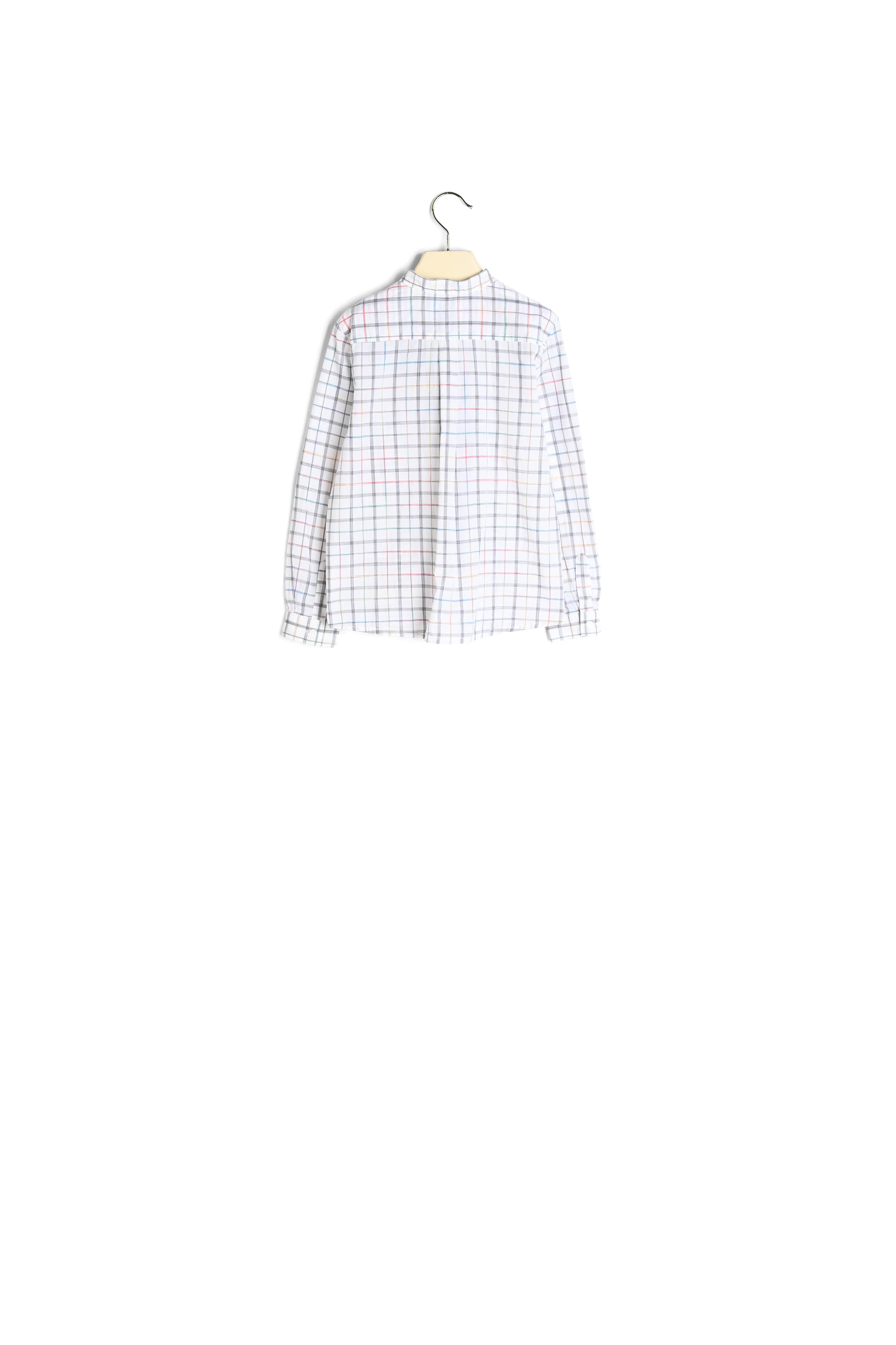 A play of white squares printed on cotton voile animates this Eugène shirt from the Playing in the Rain collection. The Mandarin collar and box pleat at the back give it an attractive style. It goes well with coordinating pants.
