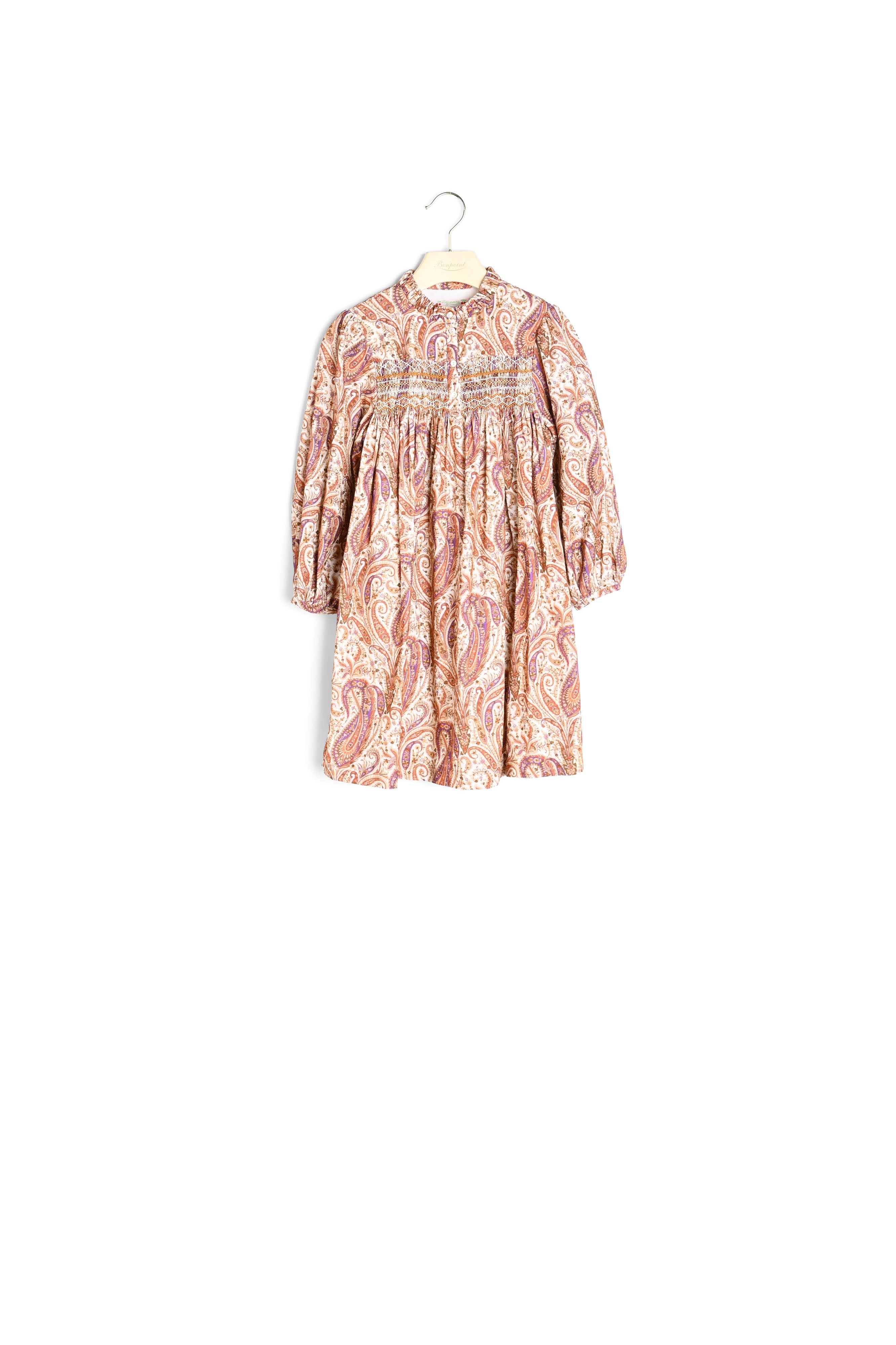 The Tamsin girls' dress is decorated with a sophisticated paisley motif and hand-embroidered smocking. It features a pleated mock turtleneck collar, a buttoned half fastening at the front, and fitted sleeves.