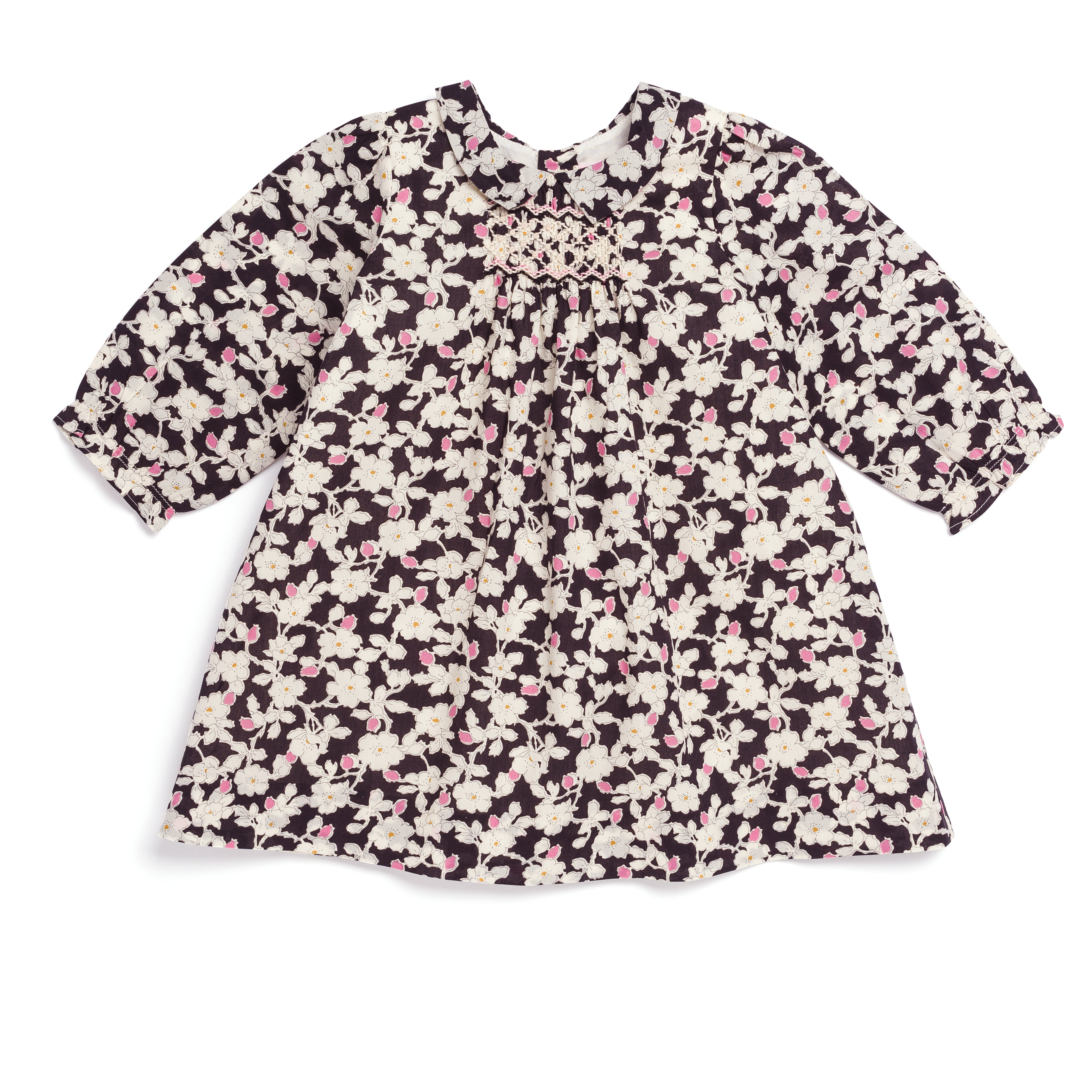 Exclusive Liberty print, hand-embroidered smocked dress, buttoned back. Winter 2018 Baby Collection.