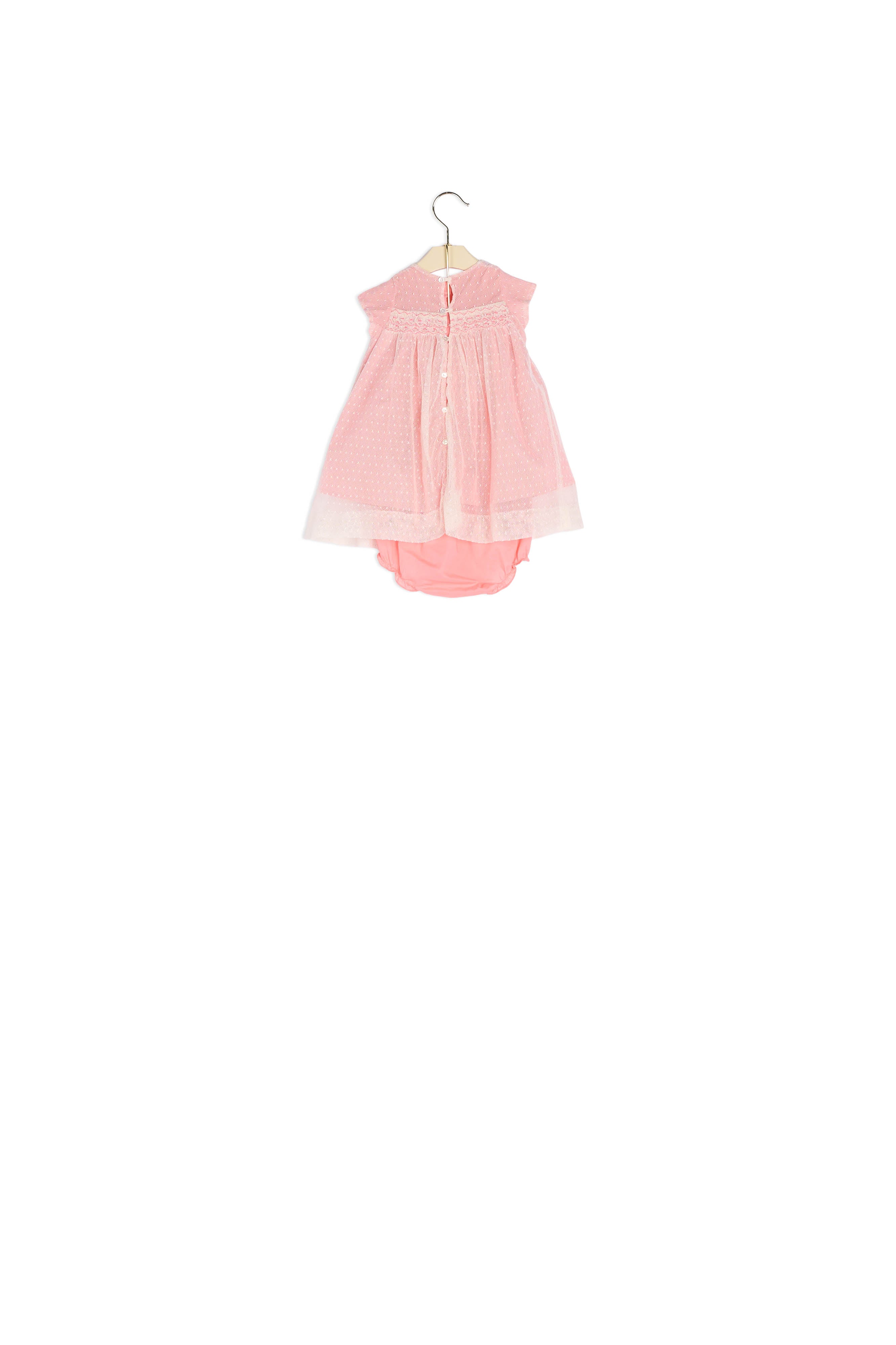 This cotton Maruska baby girls' dress is perfect for special occasions. The cap-sleeved dress has elegance down to a tee, from its light-colored swiss dot voile on a pink background, to the smocking at the chest. Pair it with matching bloomers.