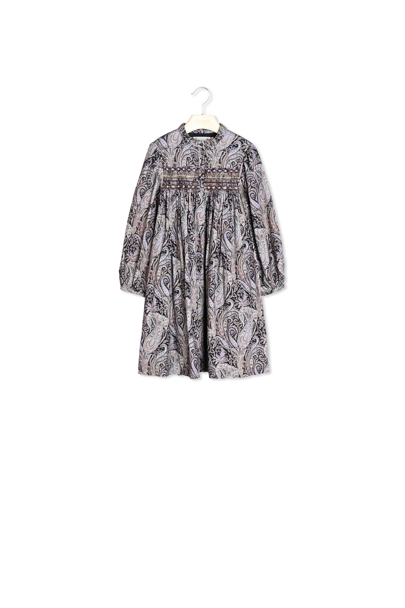 La robe Tamsin pour fille tient chaud avec son velours milleraies et sa doublure en coton. Son tissu Liberty exclusif dessine des arabesques poétiques.