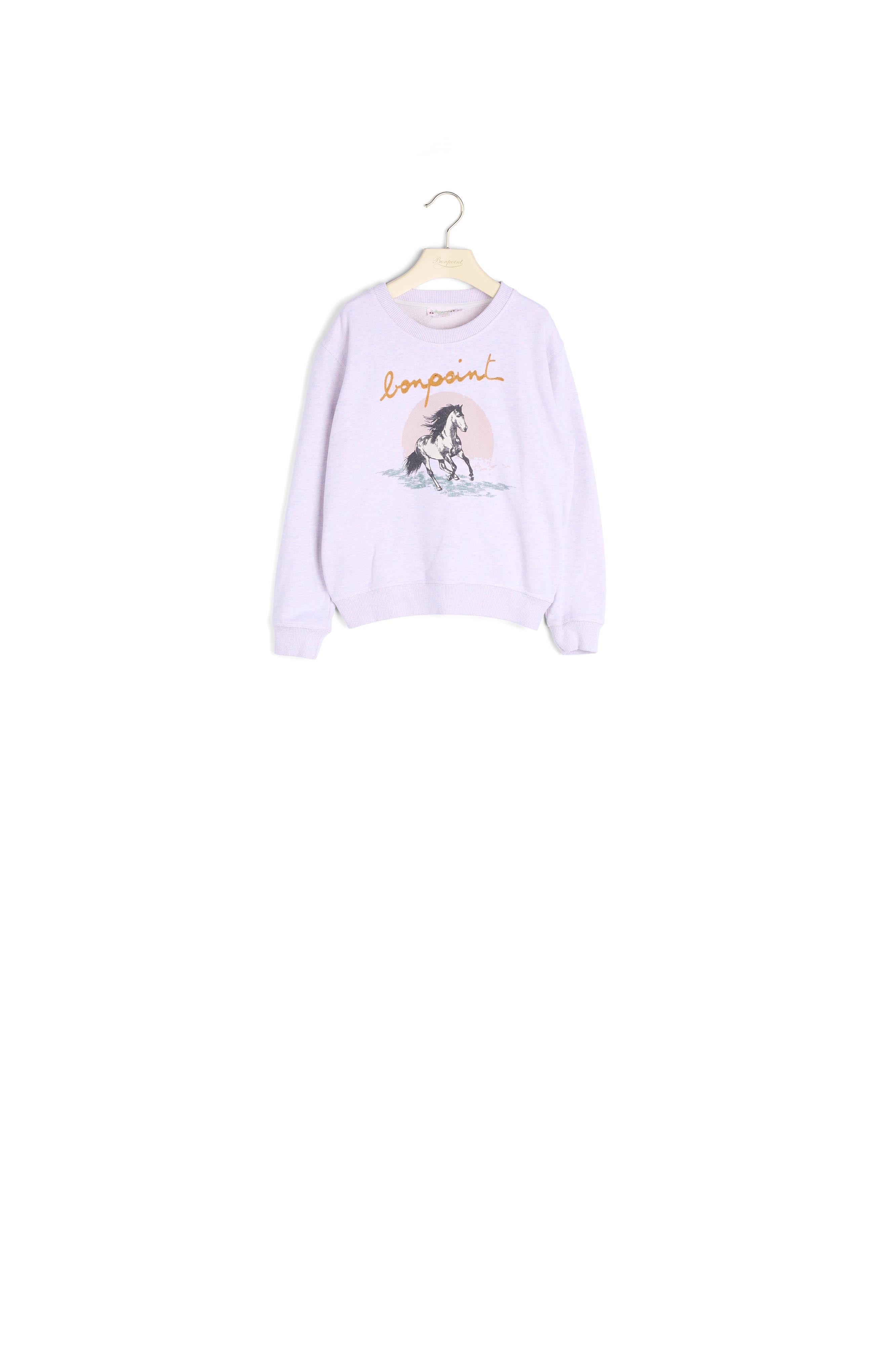 Un esprit de liberté s'empare du sweatshirt Carlota pour fille, décoré d'une sérigraphie cheval et soleil couchant légèrement délavée. La signature contrastante de la Maison vient en finition.