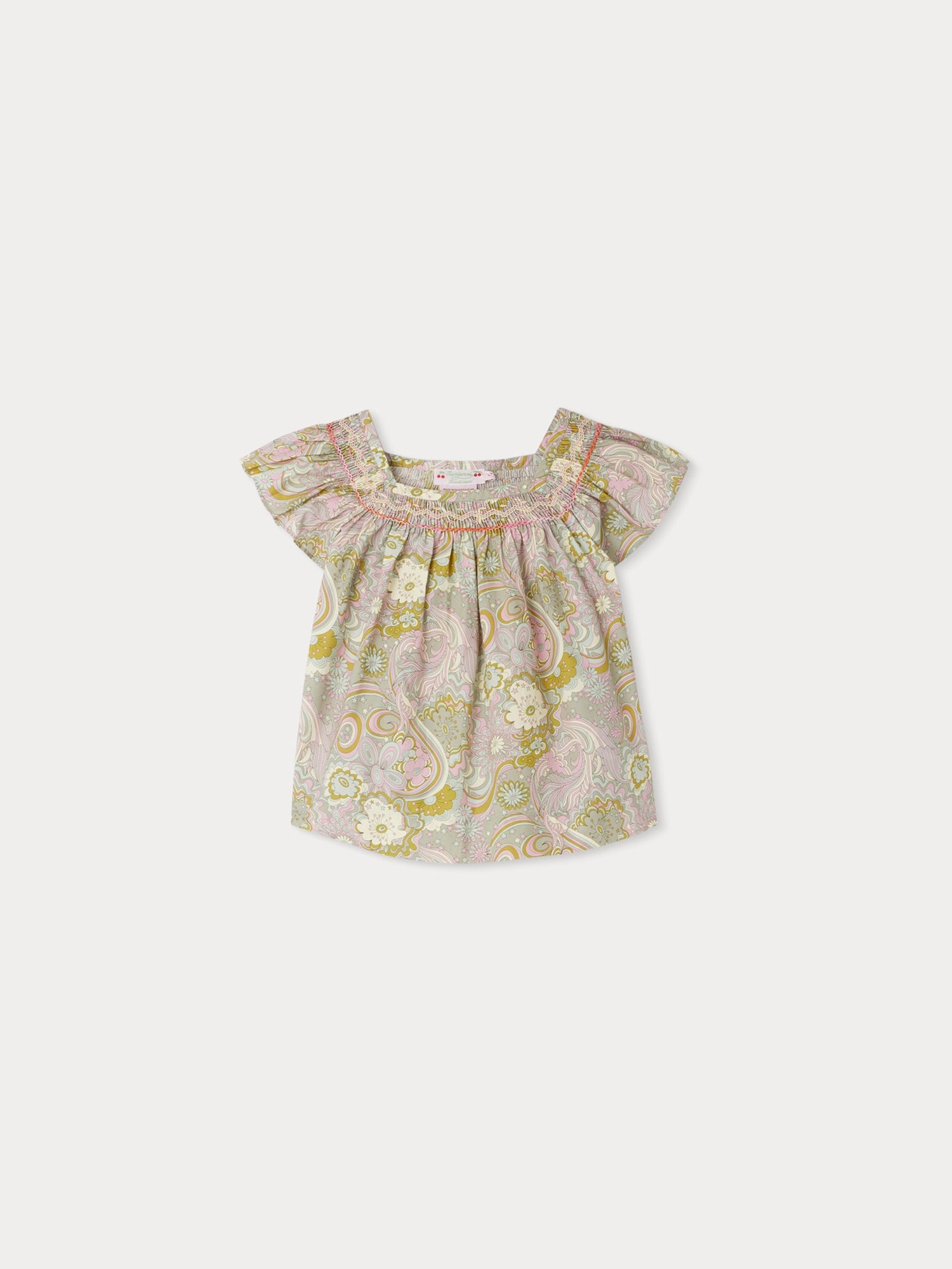 Cette blouse pour fille Carlie est ravissante avec son encolure smockée délicatement brodée à la main. Elle est confectionnée dans un tissu Liberty multicolore plein de charme. Ouverture boutonnée au dos. Manches courtes papillon.