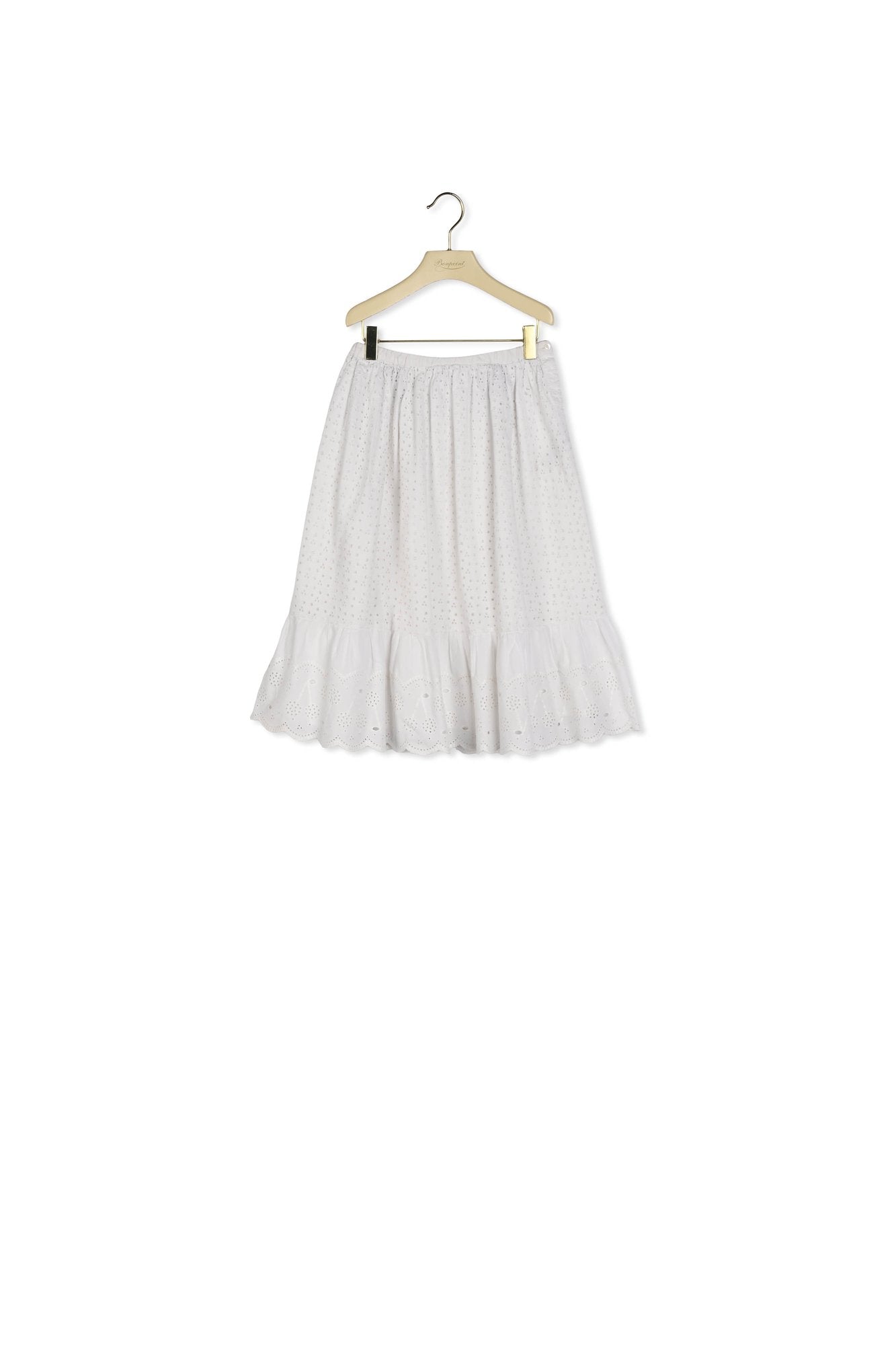 On craque pour cette jupe en broderie anglaise extraite de la collection Déjeuner sur l'herbe. Subtilement plissé et volanté, ce modèle élégant assure un look doux et bohème. On l'imagine portée avec une paire de sandales.