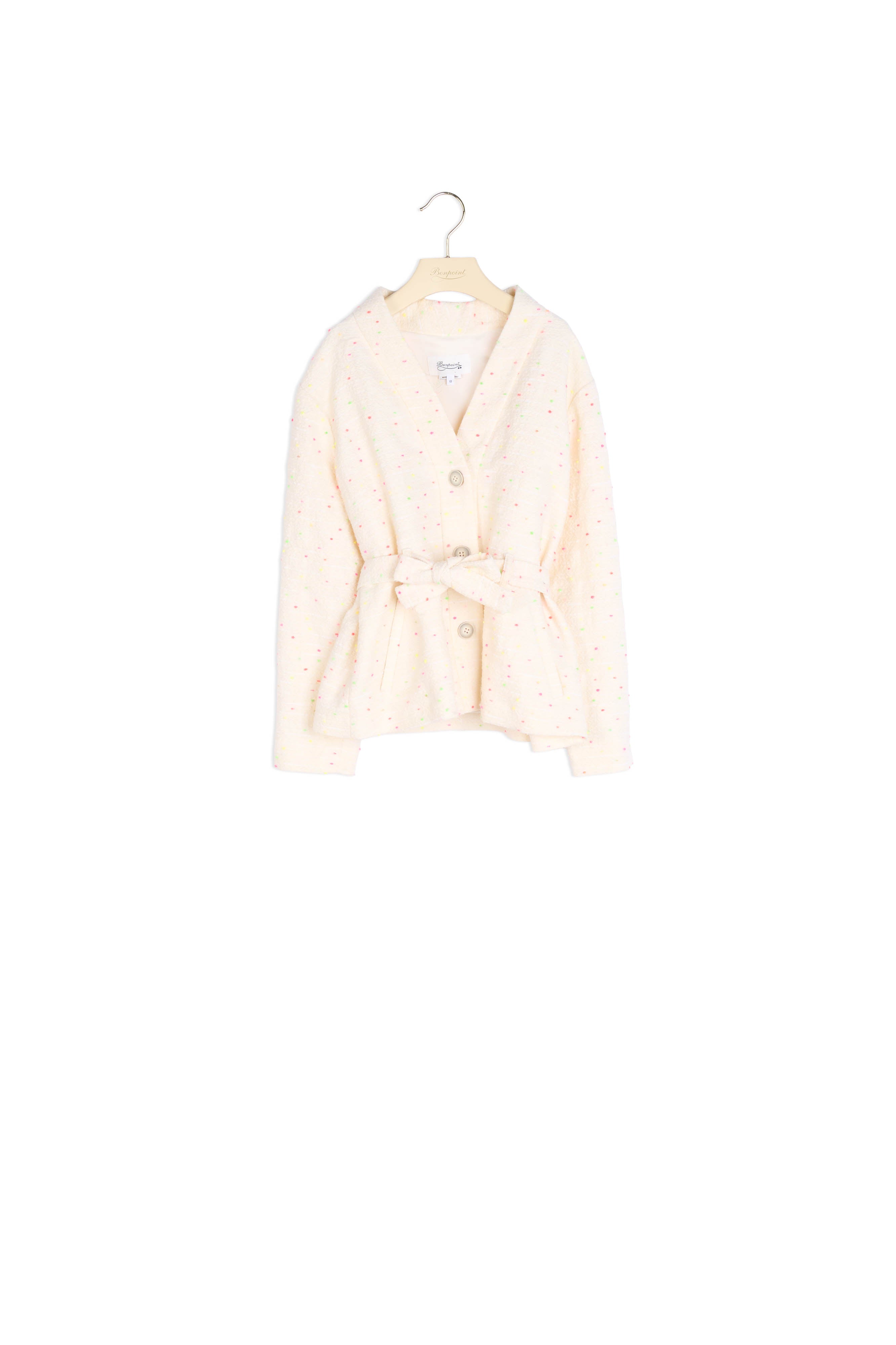 Cette jolie veste en tweed Naoli issue du thème « Déjeuner sur l'herbe » complète les tenues élégantes. Sa ceinture à nouer souligne la taille, tandis que son motif discret lui confère beaucoup de charme. On la porte avec une robe courte unie.