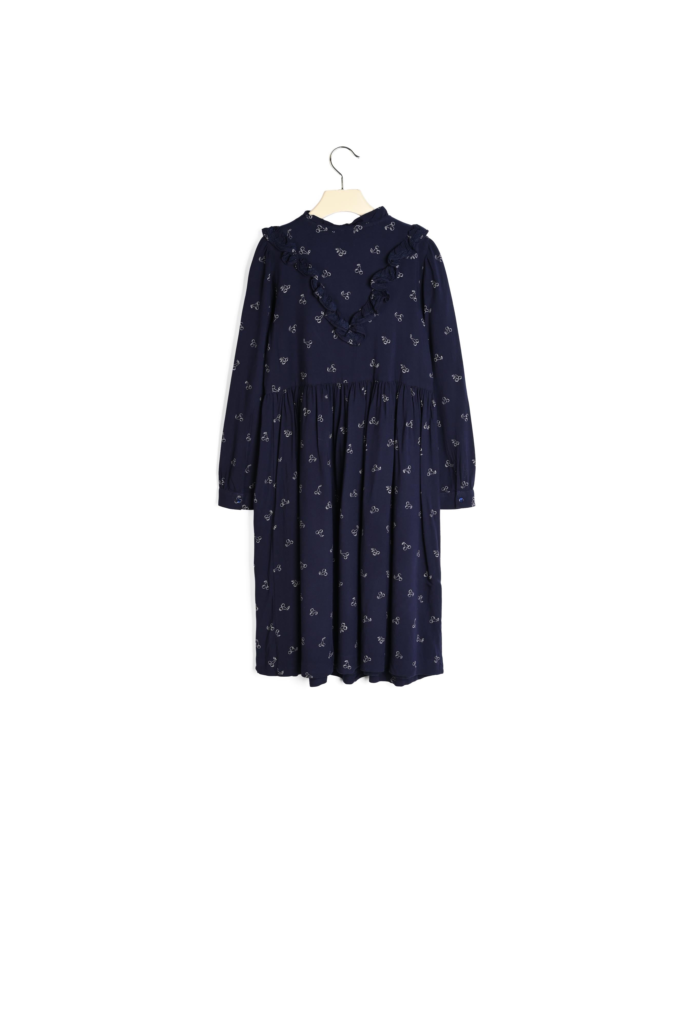 La robe pour fille Pamelie s'orne d'un joli volant avec entre-deux de dentelle sur le devant, et d'un col rond à plis couchés. En crêpe fluide, elle est signée de l'imprimé cerise Bonpoint.