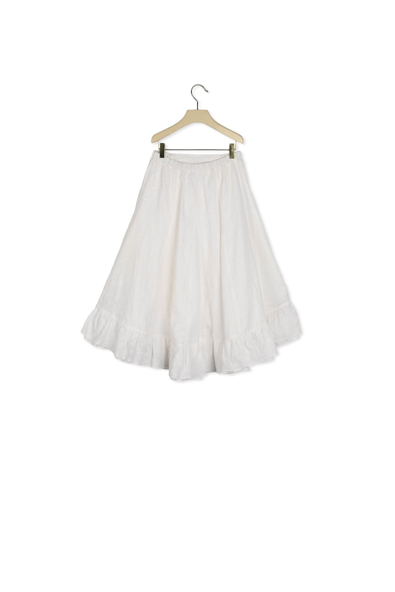 La jupe longue Nala pour fille associe matière naturelle et coupe asymétrique. En lin blanc, élastiquée à la ceinture, elle se démarque par une forme évasée et un bas volanté plus court devant. Cette pièce doublée peut être portée avec un débardeur à motifs.