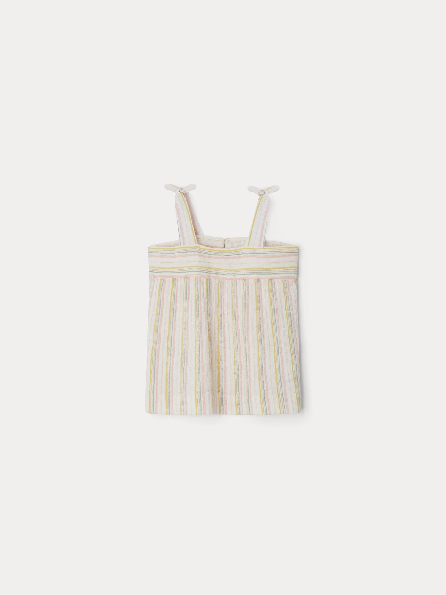 Cette blouse pour fille Andresia apporte de la couleur dans la tenue avec ses fines rayures multicolores. Elle comporte de fines bretelles à nouer.