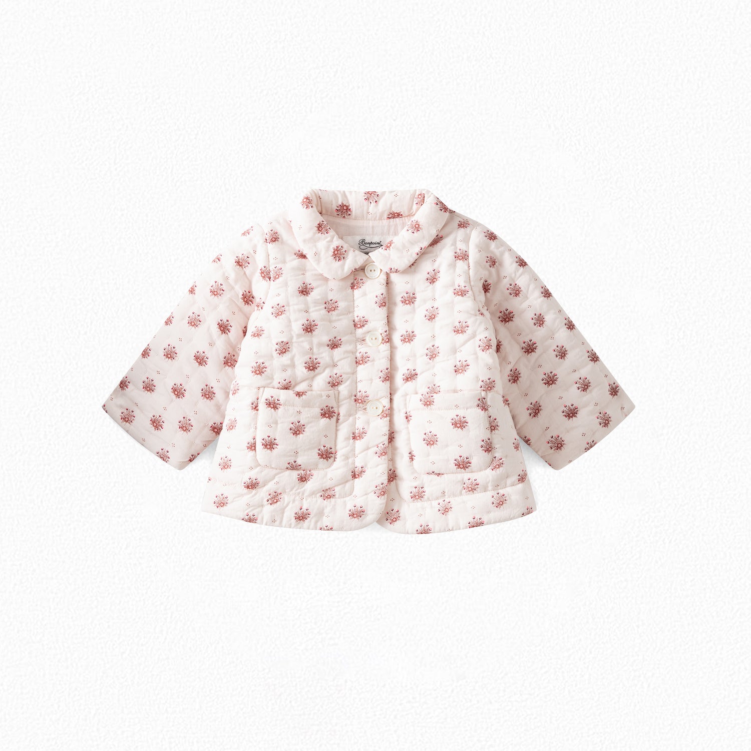En popeline matelassée certifiée bio, la veste Lutin garde les bébés bien au chaud. Avec son petit col raffiné, elle est idéale en cadeau de naissance.