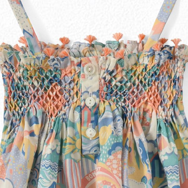 En coton biologique multicolore, cette blouse Naelie pour bébé est réalisée dans un tissu Liberty exclusif. Dotée de fines bretelles fixes et fermée par des boutons nacrés, elle est smockée et brodée à la main.