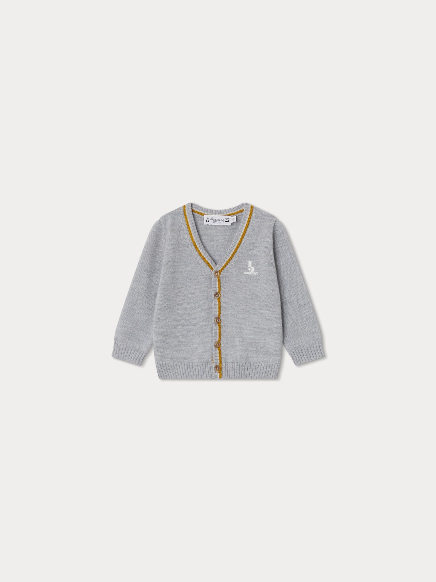 Fermé par 5 boutons, ce cardigan en laine Teotim pour bébé dispose de manches longues et d'un col en V. Le liseré coloré et le logo Bonpoint brodé sur la poitrine lui confèrent un style collège craquant.