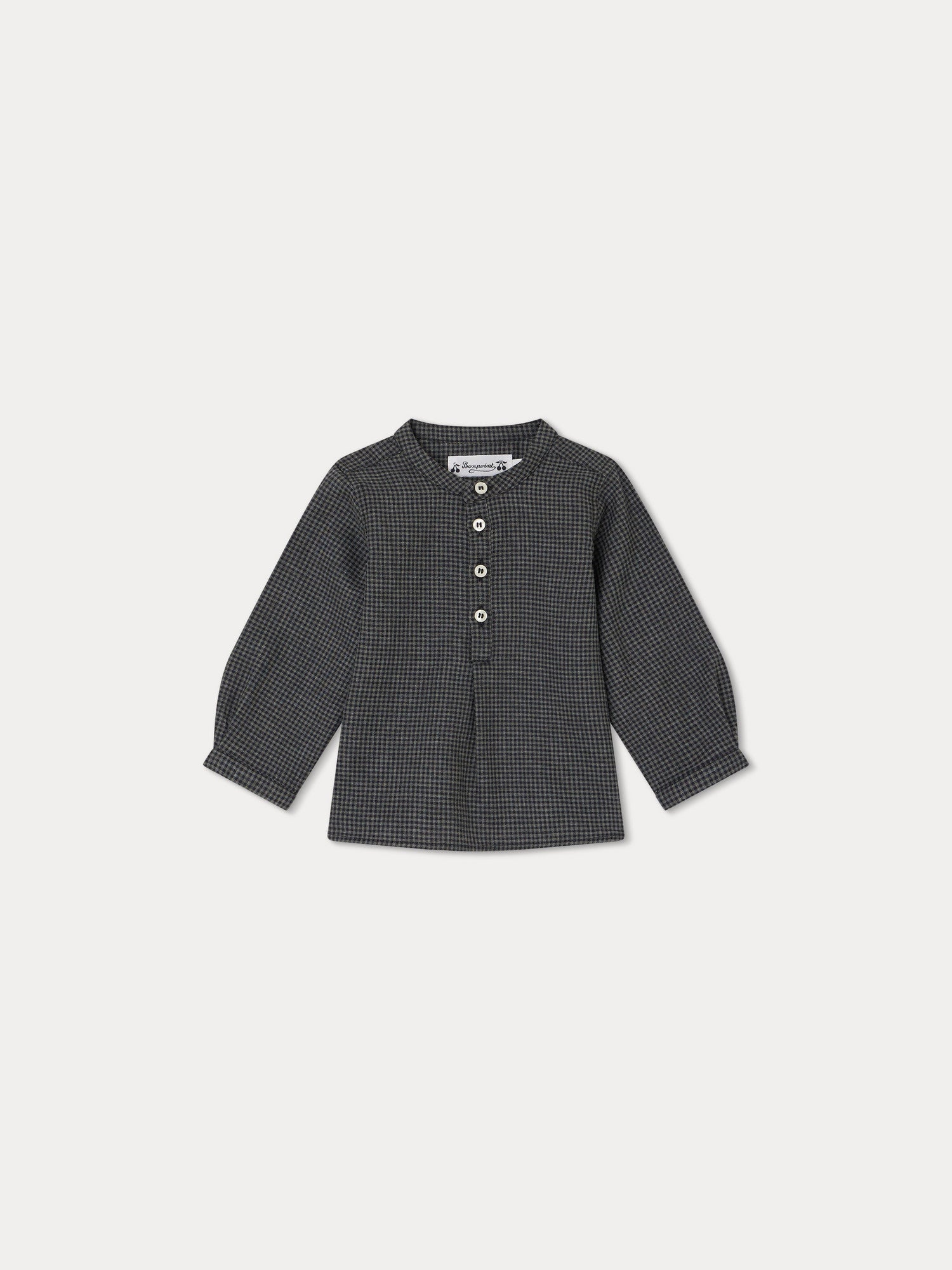 La chemise Polisson pour bébé mise sur un imprimé à petits carreaux très raffiné. Son encolure ronde droite se complète de quatre boutons contrastants, comme un col tunisien.