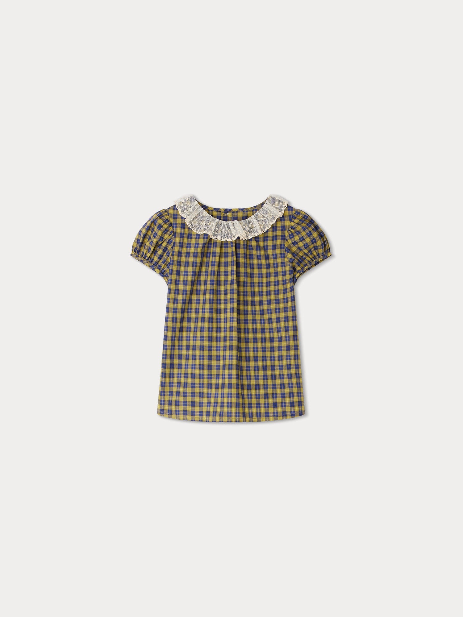 La blouse Cyrine pour fille affiche des carreaux colorés à la tendance rétro. Une collerette en voile à plumetis rehausse ce modèle droit en coton biologique.