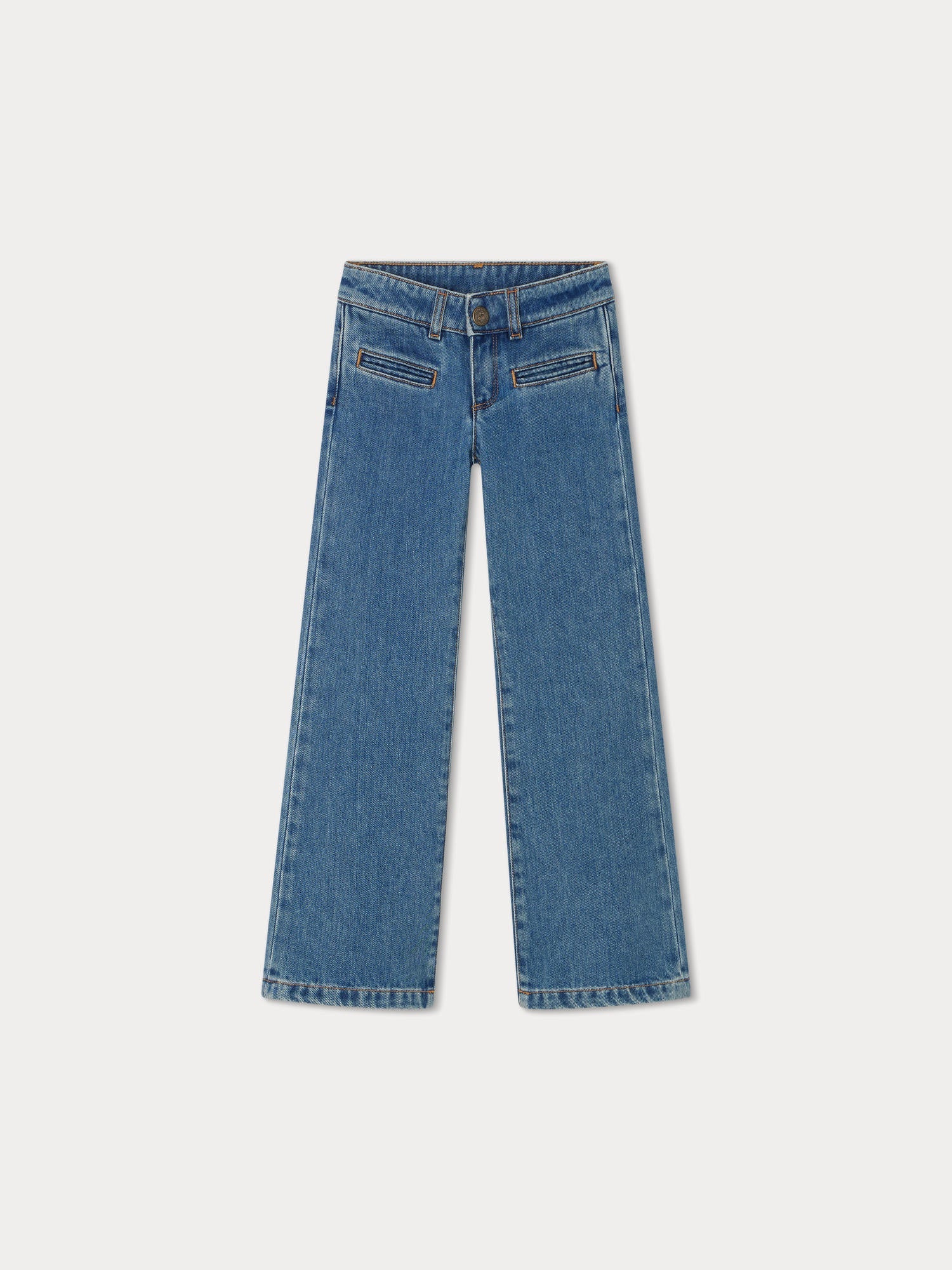 Conçu en denim recyclé, ce pantalon Bestie pour fille adopte une coupe large accentuée par 2 poches obliques passepoilées à l'avant. Le jacron, une poche arrière et le bouton portent la signature Bonpoint.