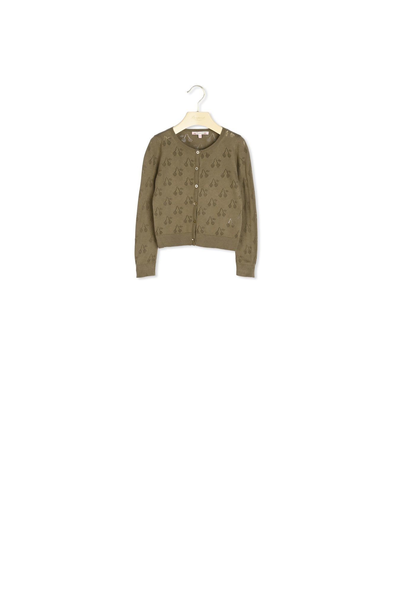 Ce cardigan en coton complète avec grâce la garde-robe des petites filles élégantes. Sa coupe traditionnelle à col rond et fermeture boutonnée est twistée par un motif malicieux aux cerises ajourées. Assumez son côté classique en l'associant à une petite robe fluide et des sandales.