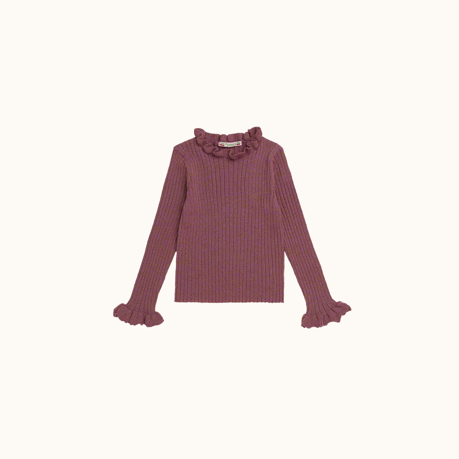 Ce ravissant pull en laine du thème Electro Pop multiplie les détails raffinés et modernes. La maille côtelée est parsemée de fibres métalliques, les poignets sont évasés et froncés et le col rond est rehaussé d'une collerette harmonieuse.