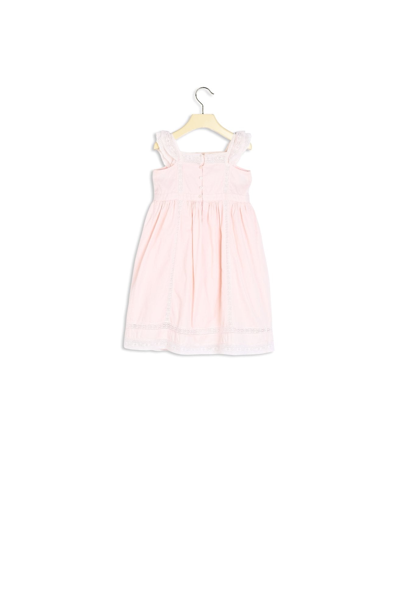 Robe bretelles en piqué de coton, insertions de dentelles, mancherons en broderie anglaise. Collection Fille Été 2018.