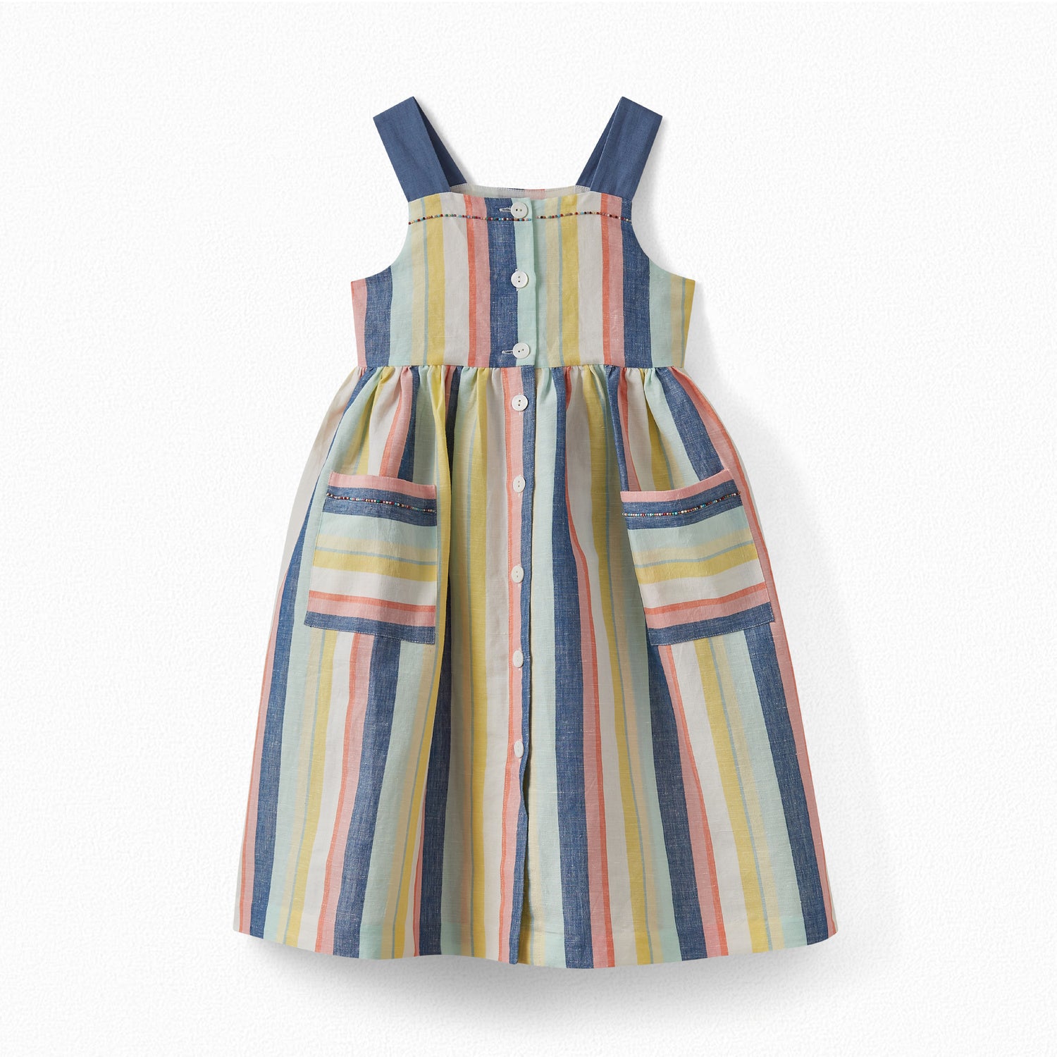 La robe Laly pour fille s'amuse avec la couleur à travers ses jeux de rayures rebrodés de perles. Ses deux poches plaquées lui ajoutent une note rustique.