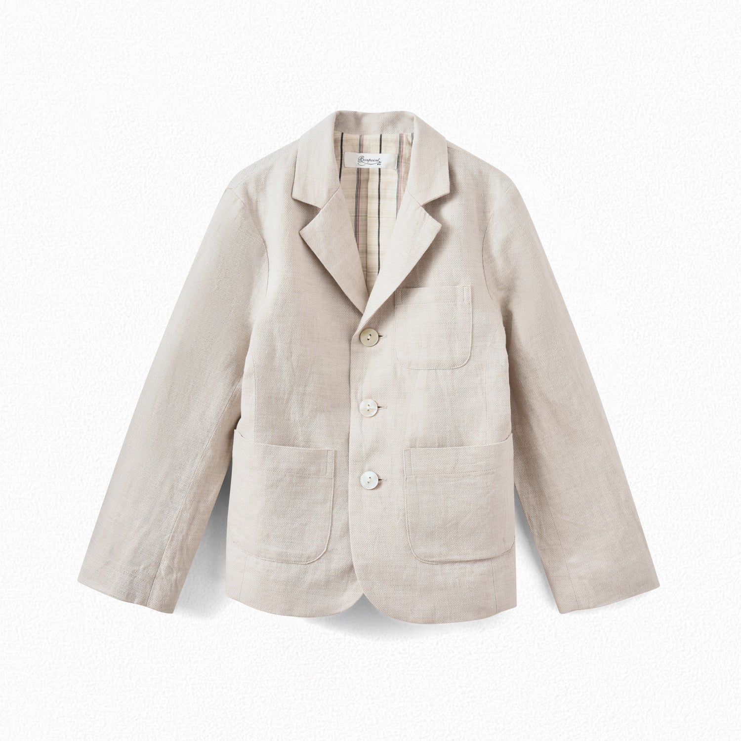 La veste Lucas pour garçon possède un charme rétro avec son tissu en coton et lin filé et tissé à la main et sa doublure à carreaux. Elle se caractérise par ses trois grandes poches plaquées devant.