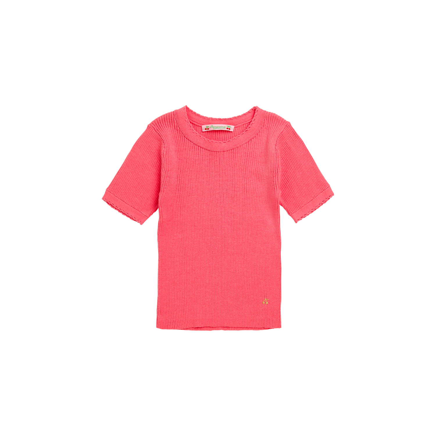Ce pullover à manches courtes pour petite fille dévoile une maille légère en coton, tissée en côte fine 2x2. Il est décoré de liserés dentelés placés autour de l'encolure ronde et aux manches.