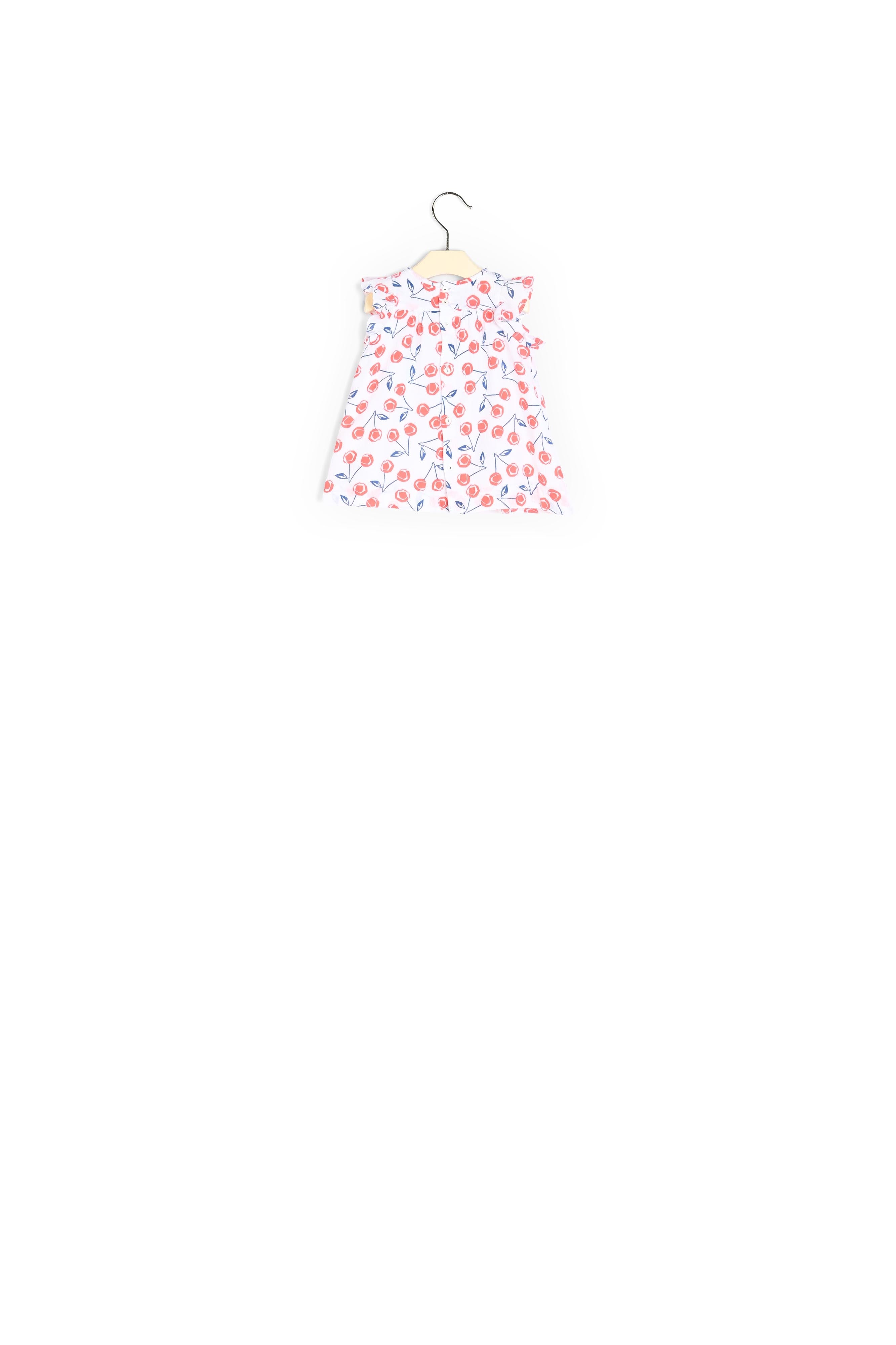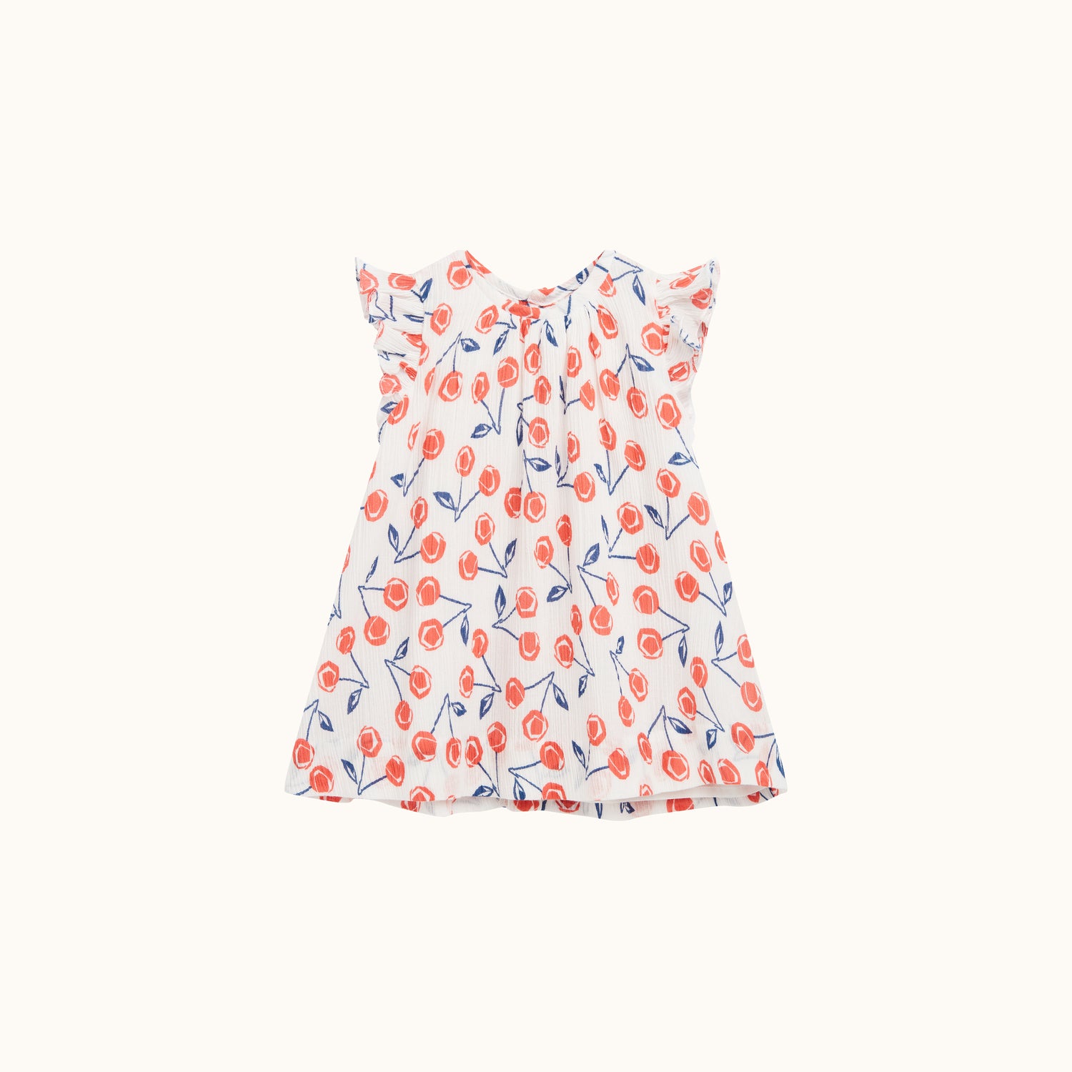 On craque pour l'imprimé cerises de cette robe de la collection « Playing in the rain ». Entièrement boutonné dans le dos, ce modèle ample et évasé se caractérise par des manches volantées et le motif cerises emblématique de Bonpoint.