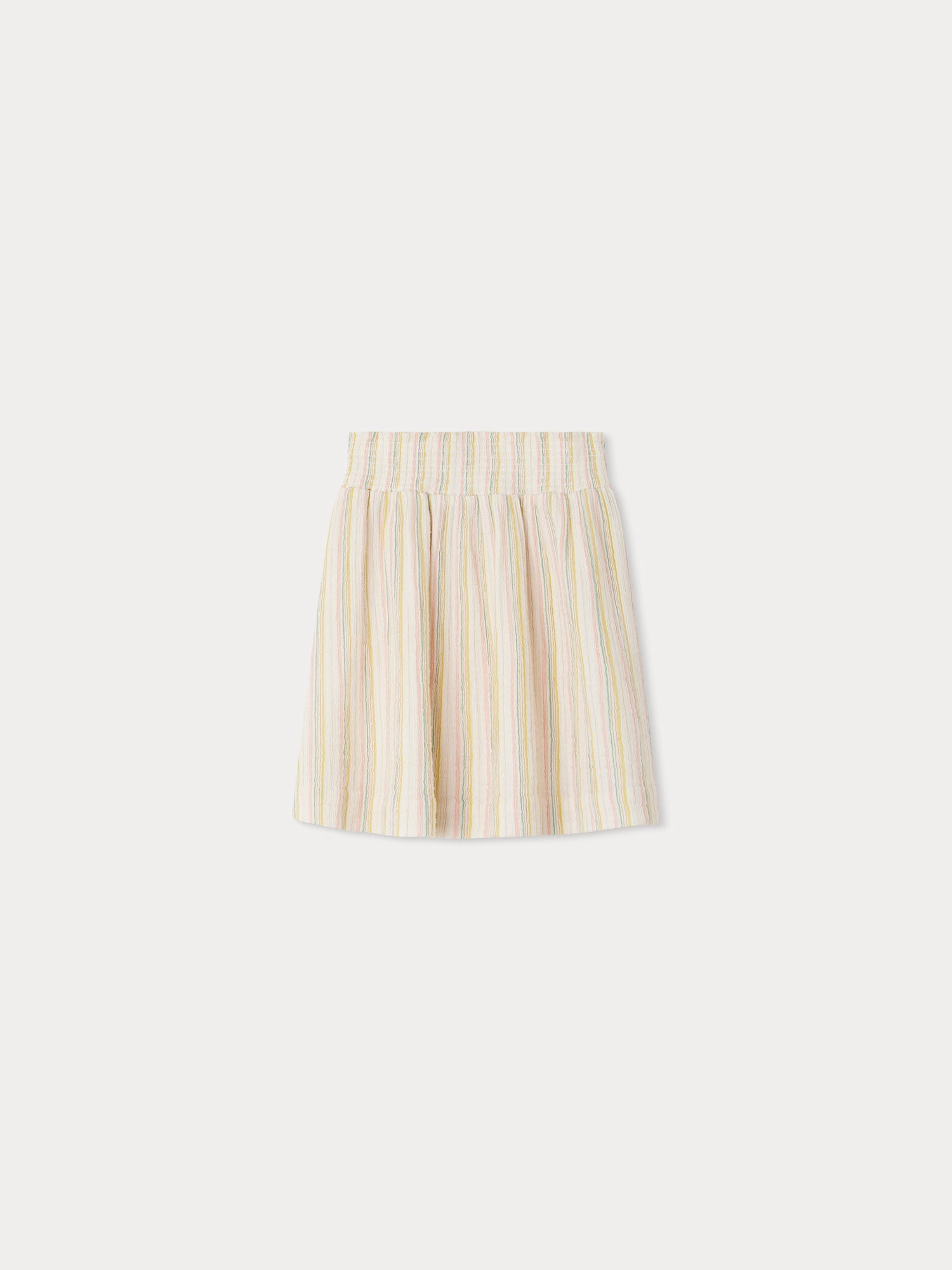 Cette jupe pour fille Noumea est à la fois élégante et agréable à porter grâce à sa large taille smockée. Ce modèle se pare d'un motif à rayures tricolores aux teintes douces.