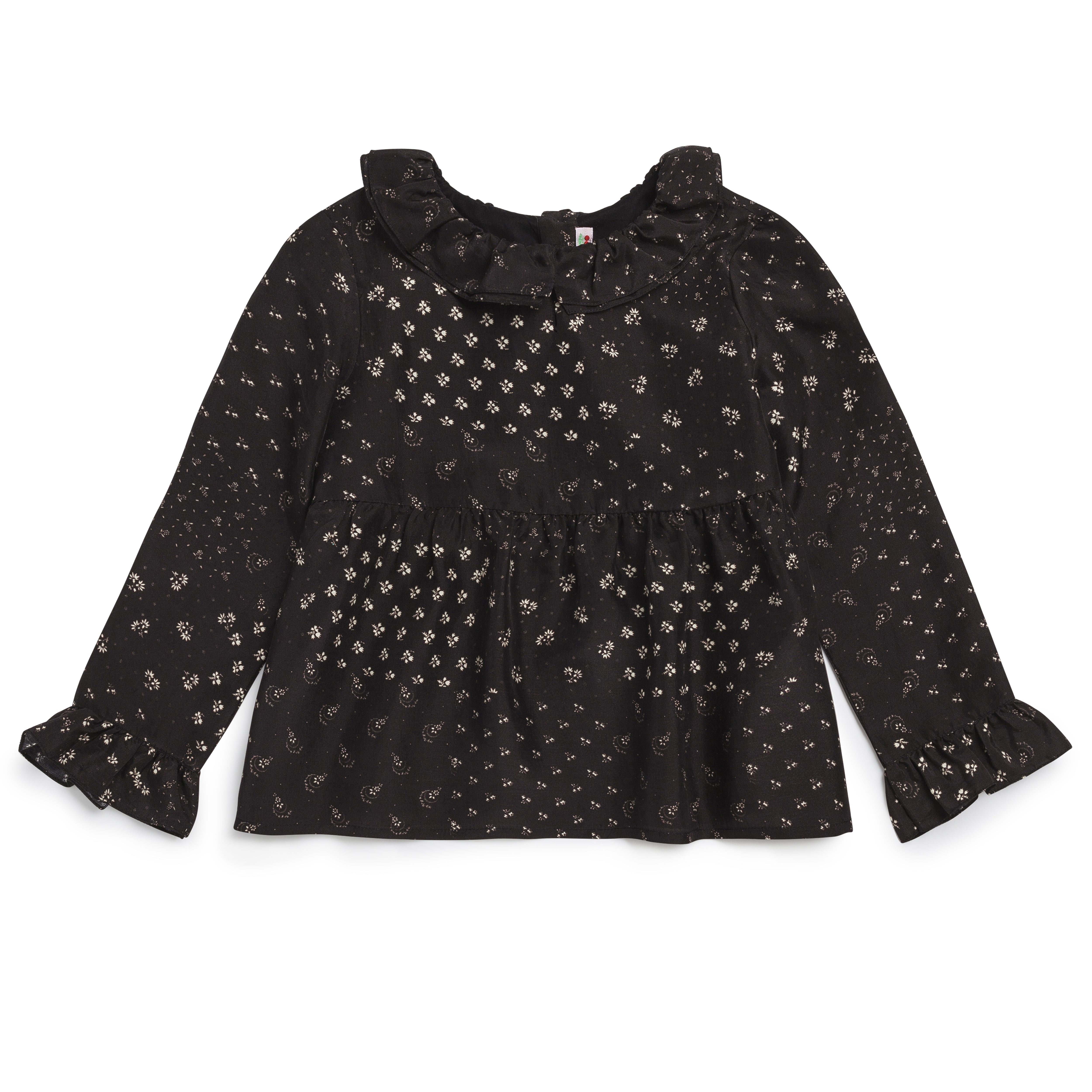 Blouse en soie imprimée, col et bas de manches volantés, boutonnage dos. Collection Fille Hiver 2O18.