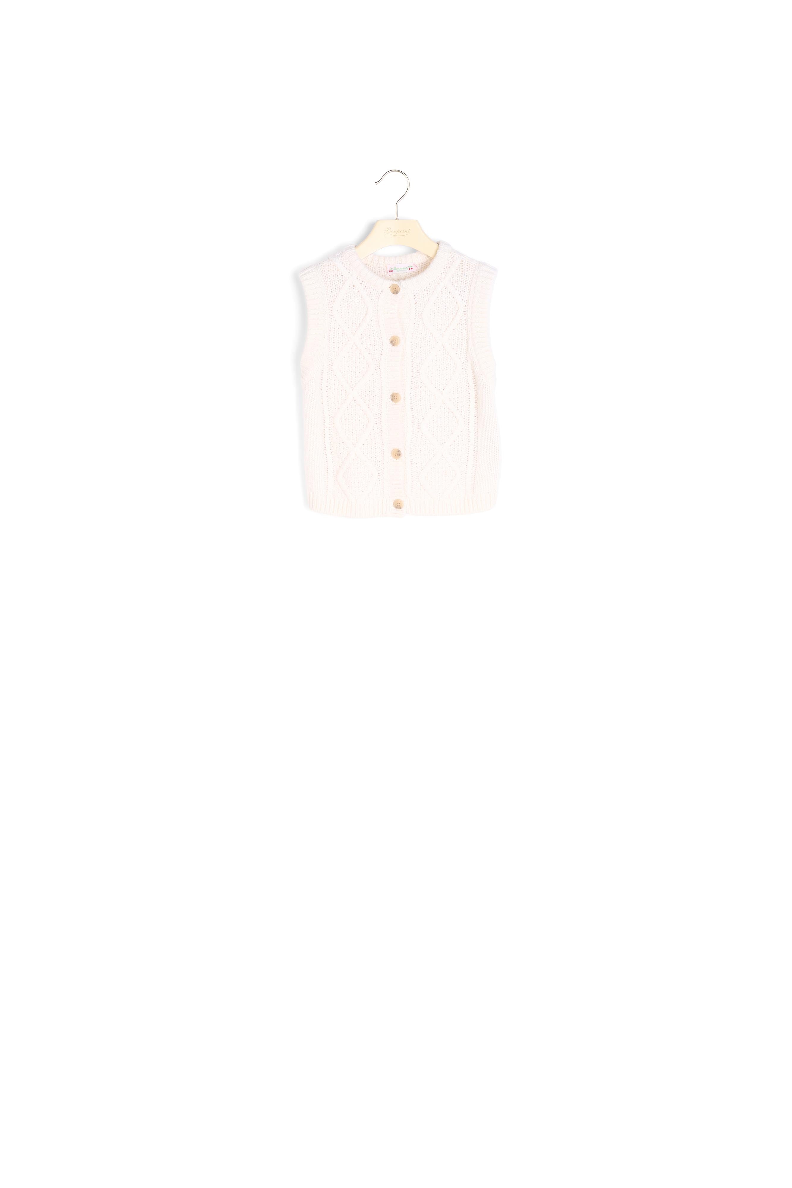 Ce cardigan sans manches Bobolene s'orne de torsades en diamants. Le col rond et les emmanchures sont renforcés d'un bord-côte raffiné.