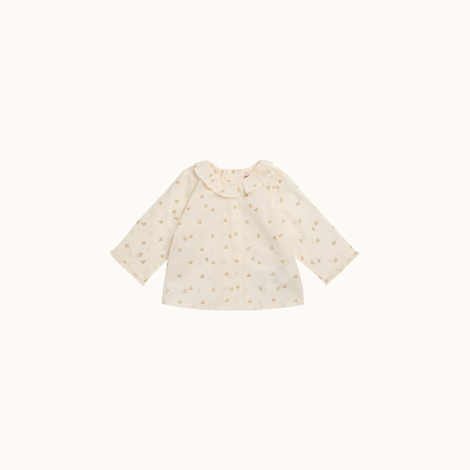 En voile de coton vaporeux, la blouse Ganiti illumine les tenues avec poésie. Parsemée des cerises Bonpoint, dorées sur fond blanc, elle possède un col Claudine volanté, des petits volants sur les poignets et une fermeture boutonnée au dos.