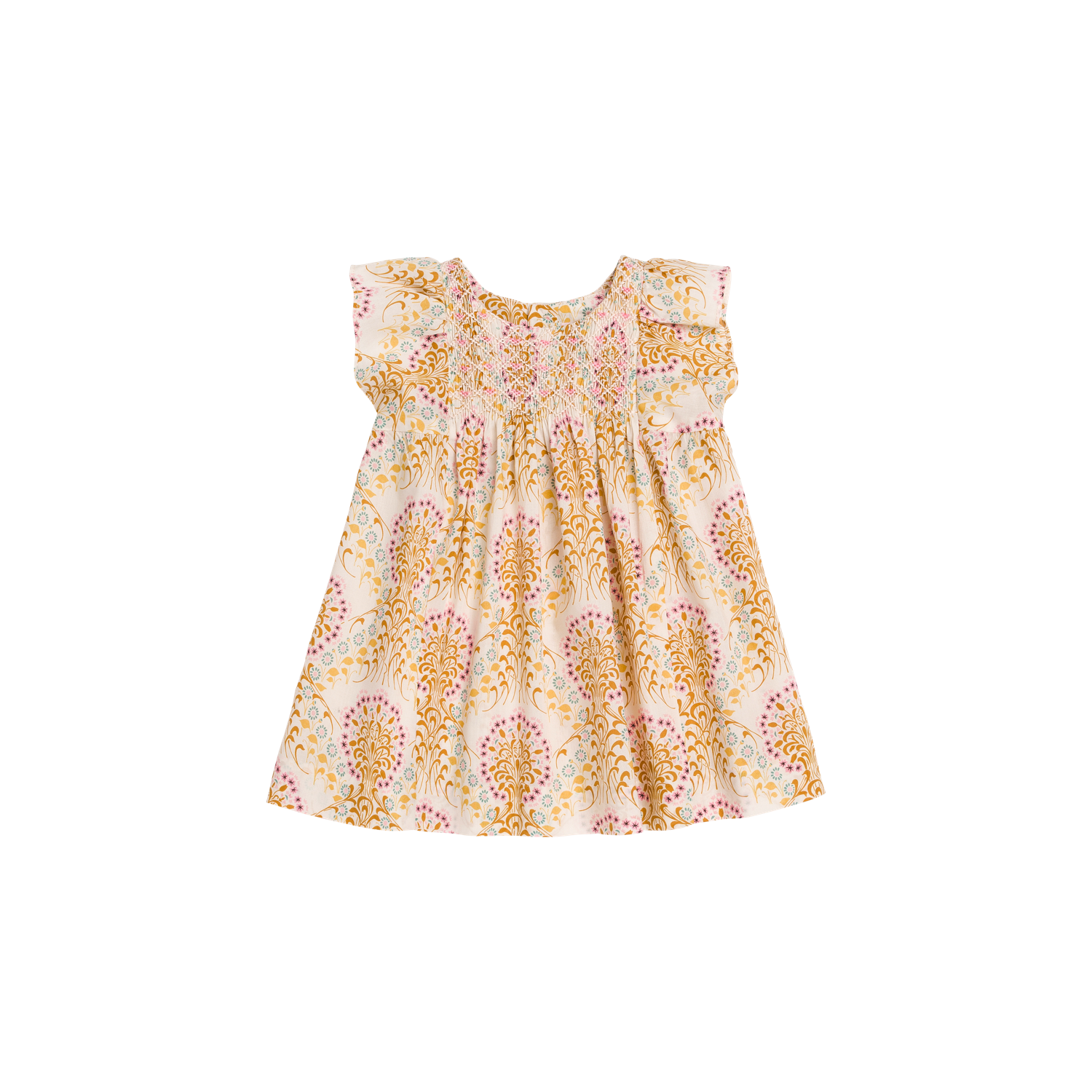 Cette robe Cadelili à manches courtes se distingue par son charmant imprimé. C'est un modèle original et joyeux, rehaussé par de jolies emmanchures à volants et un décolleté smocké très chic.