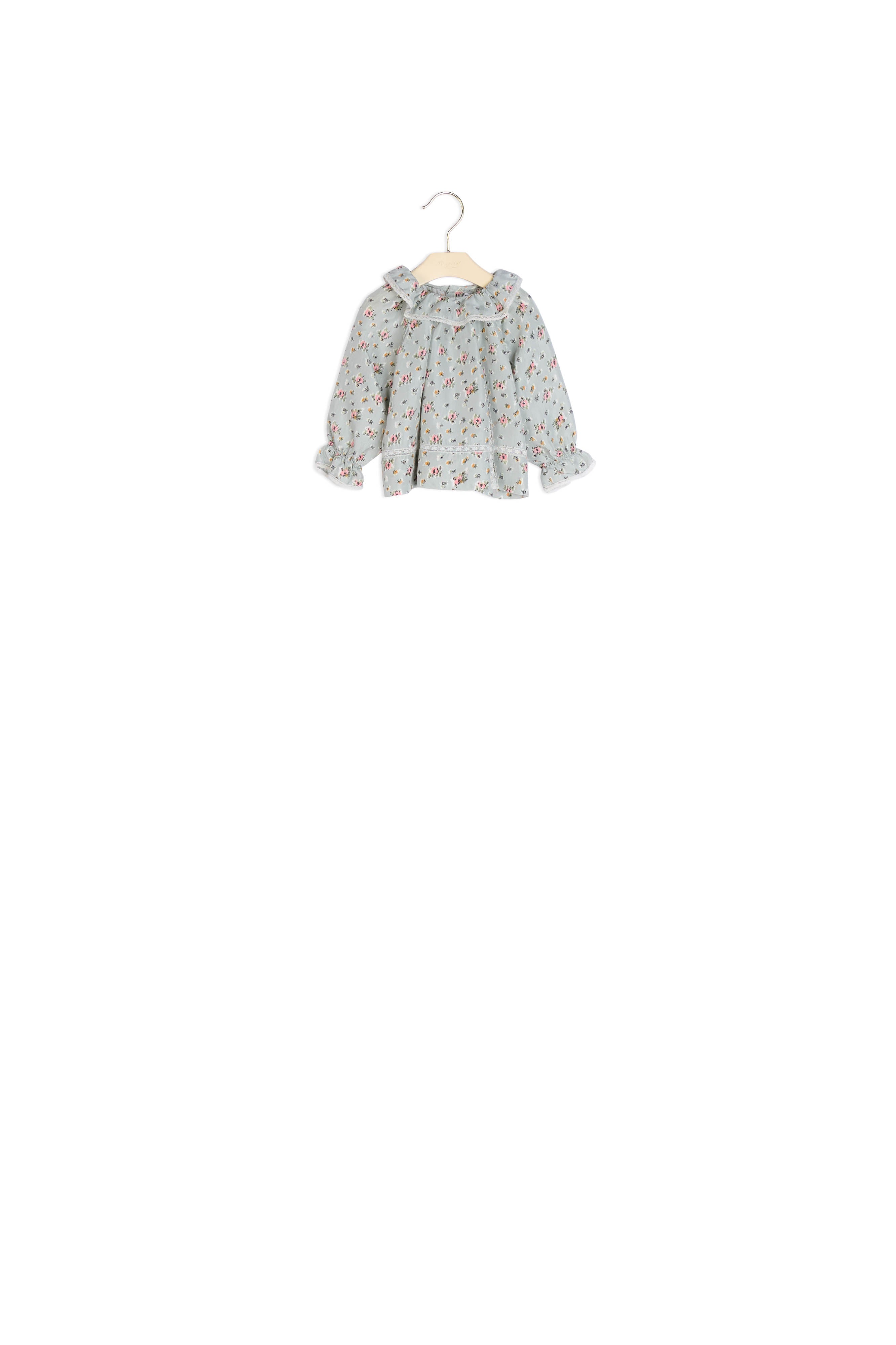 La blouse Myrtille pour bébé marie confort et sophistication avec sa soie fluide imprimée de délicats motifs floraux. Sa coupe évasée se démarque par ses détails en dentelle entre-deux et son jeu de plis sur le buste.