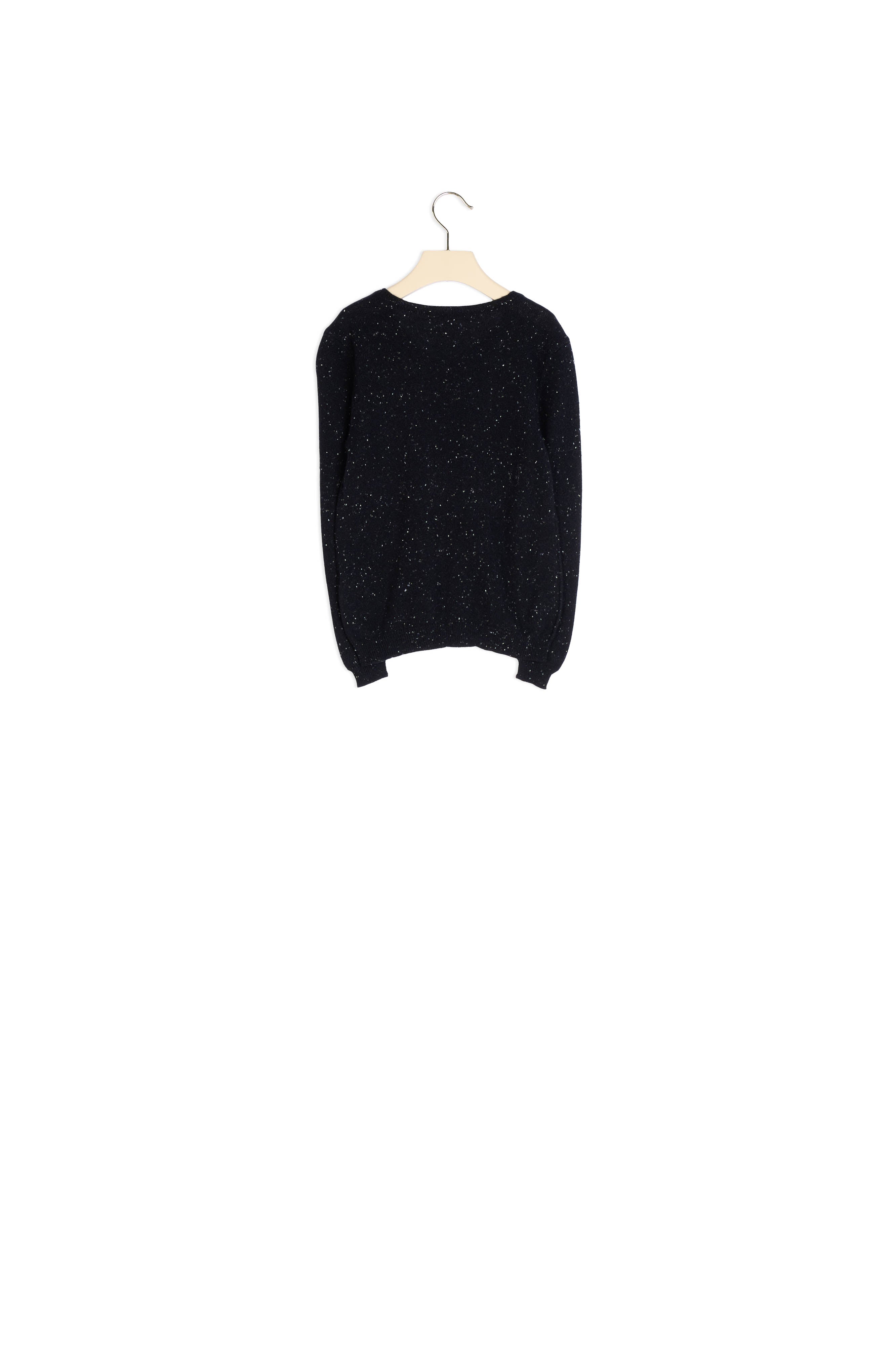 Ce pull pour garçon en cachemire, modèle iconique signé Bonpoint, se distingue par sa maille effet moucheté. Doté d'un col V et de coudières, il marie décontraction et élégance avec brio.