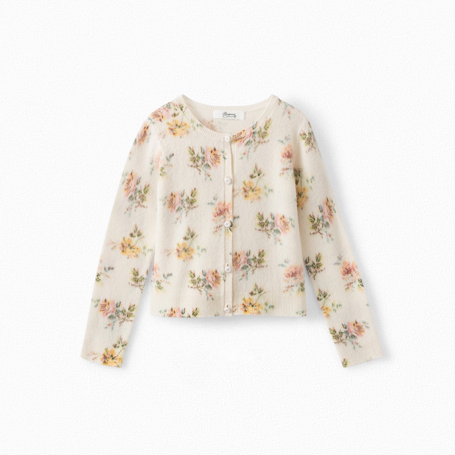 Ce cardigan pour fille, iconique de la Maison, se pare d'un élégant motif de fleurs. Doté d'un col rond et tricoté en pur cachemire, il est doux et souple sur la peau. Laine de cachemire. Coupe droite.