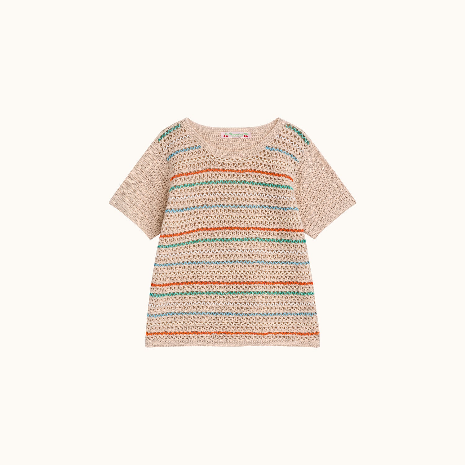 Très élégant, ce pull à manches courtes en coton séduit par ses motifs multicolores. Léger grâce aux détails ajourés de sa maille crochet, il est agréable à porter lors des journées chaudes. On l'associe à un short uni.