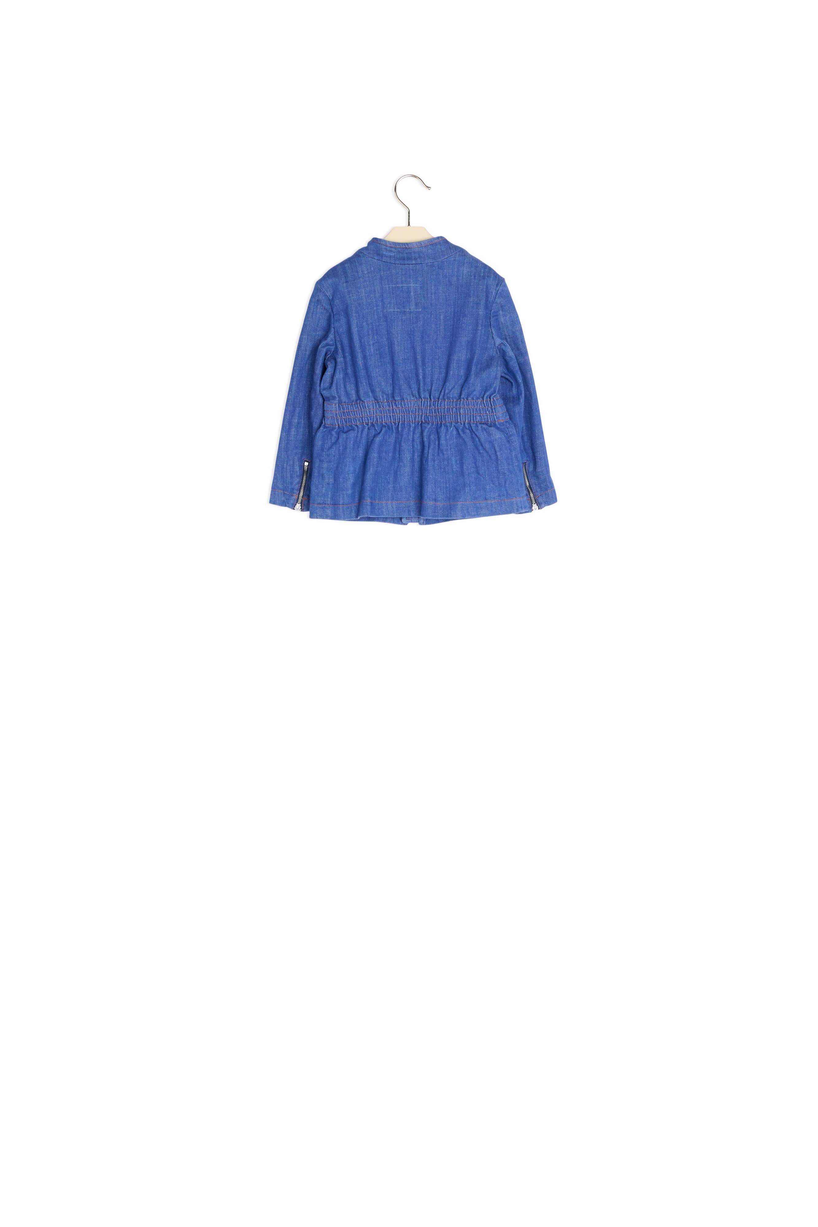Veste ceintrée en denim, fermeture zippée, détail zip bas de manches. Collection Fille Été 2018.